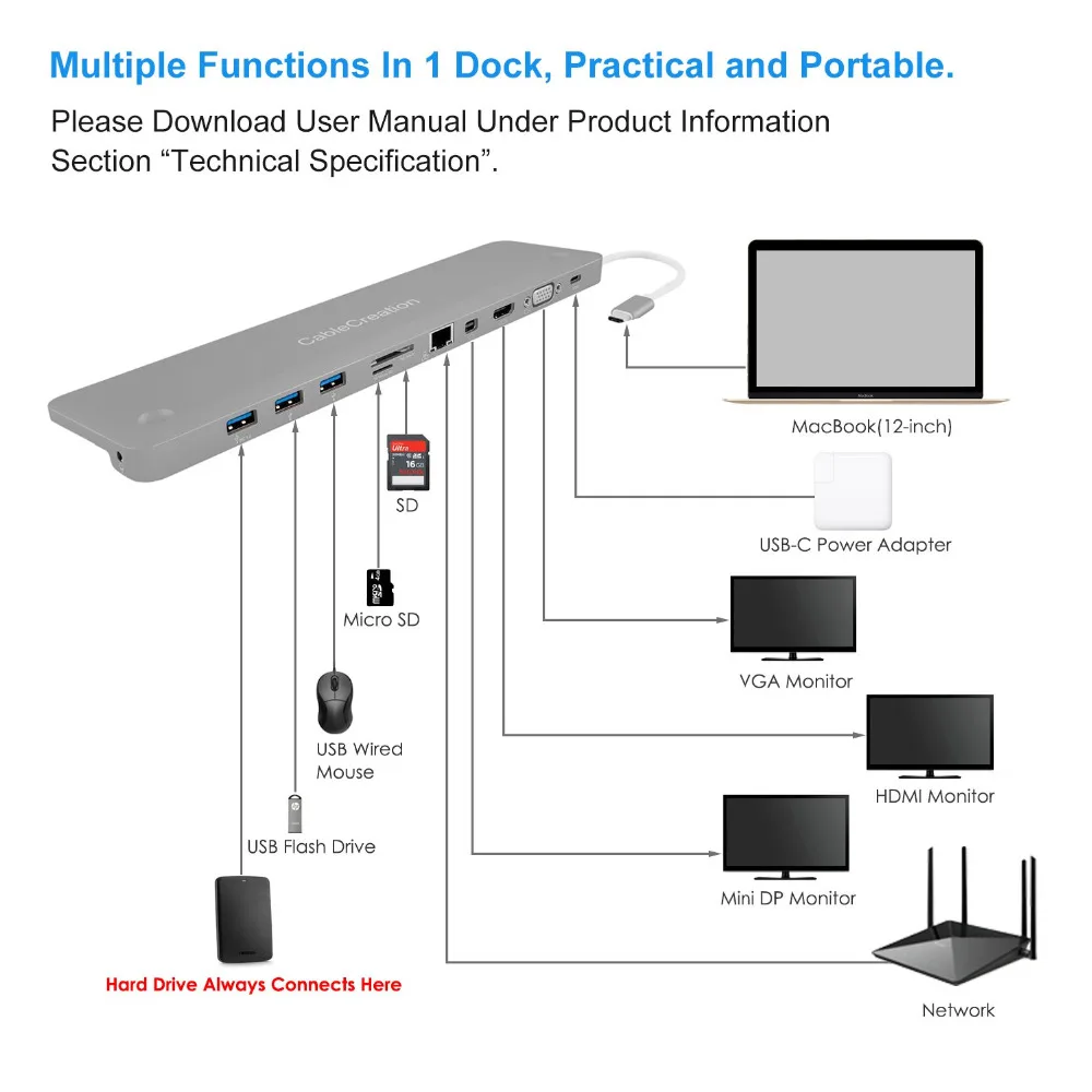 -- Для использования двух мониторов 1. Пожалуйста, держите адаптер полностью неподвижным с компьютером, как только они подключены. Не подключайте и не отключайте кабель и адаптер. 2. Порты Mini DP и VGA работают вместе, сначала Подключите порт Mini DP к монитору Mini DP, настройте Разрешение монитора Mini DP на 1080P, затем подключите порт VGA к монитору VGA. Они не могут работать вместе, если разрешение монитора Mini DP 4K. 3. Мини DP и HDMI порты работают вместе, такая же процедура, как и мини DP, работает вместе с портом VGA. -Режим зеркала и расширения 1. Для системы MacOS: верхний левый угол значок Apple-> системные настройки-> дисплеи-> зеркальные или расширенные дисплеи. 2 внешних монитора будут отображать друг друга, но оба изображения могут отличаться от экрана ноутбука. 2. Для системы Windows 10: нажмите клавишу Windows + комбинированную команду P-> выберите «дублировать» или «продлить». -- Для 3 портов USB 3,0 A, общий выход 10 Вт (5 В/2 а), максимальная скорость передачи данных 5 Гбит/с 1. Мы предлагаем вам подключить устройство хранения к порту BC 1,2 с макс. 7,5 Вт (5 В/1,5a). 2. Общая мощность 3 USB-A составляет 10 Вт (5 В/2 а), 1 порт поддерживает BC 1,2, два других порта делятся максимум 5 Вт (5 В/1 а). -- Для sd-карты, Micro SD карты портов, только читать один сразу.