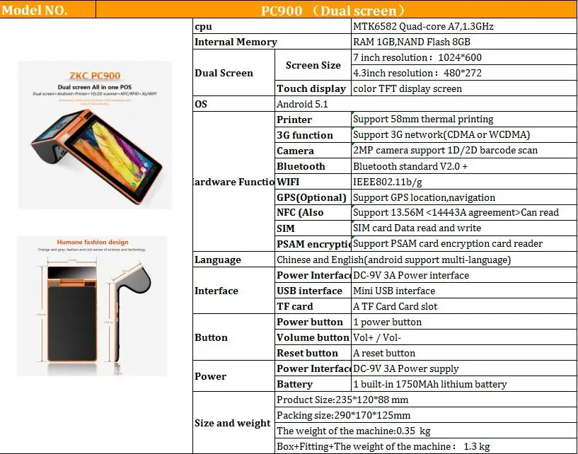 ZKC900 со следующими деталями: 1.Android 5,1 Экран 2,7 "и 4,3" 3,1 ГБ Оперативная память + 8 Гб Встроенная память 4. Поддержка 2G/3G/WIFI/BT4.0/NFC/RFID Камера 5.2MP, Поддержка 1D/2D сканирования штрих-кода 6. Встроенный 58 мм bluetooth термопринтер 7. Один слот USB/Слот для sim-карты 8. Один год гарантии 9. Предоставляем бесплатный SDK