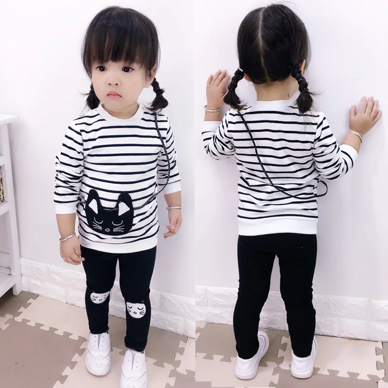 2017 Весна бренд domeiland Детский бутик костюмы наборы одежды 2шт. Детская Девочка Хлопок Полосатый милый кот брюки костюм одежда