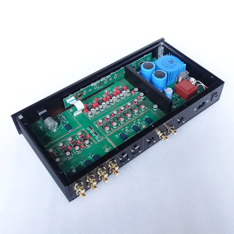 Эта машина для поддержания оригинальной машины и выбора материалов, особенно емкости, больше, чем оригинальная машина, например, оригинальная машина является обычной емкостью nikon GU с черным, мы используем конденсатор основного фильтра nikon blue BC, случайно выполнив часть, чтобы оставить конденсаторы ELNA евро, Главный Силовой трансформатор, улучшенный до 25 Вт, после тестирования часть блока питания переключается на лучшую схему класса А. Добавлен выбор пульта дистанционного управления и функция дистанционного управления громкостью. Панельный выключатель выбирается светильник Ки мягкой кнопки, интуитивно понятное и простое управление. Схема каждого блока дополнительно оптимизирована. Печатная плата позолоченная с 14 операционными усилителями, среди которых 4 шт. 5532 являются входной буферизацией, 4 шт. 5534-основным усилением, а 6 шт. 5534-выходной буферизацией, все для лучшей производительности. В этой версии измеренный шум низкий, искажения низкие, частотная характеристика теста AP 0-100k плоская, реальная аналитическая мощность прослушивания высокая, качество звука прозрачное без тона, трехчастотный баланс, низкая частота толстая и сильная.
