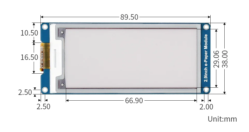 | 2,9 дюймовый модуль электронной бумаги | Черный, белый | 2. | 296 × 128 | 66,89 × 29,05 | 89,5 × 38,0 | 2. | √ | SPI | ||
