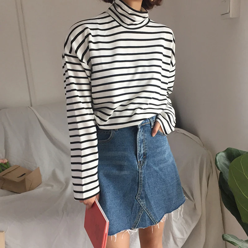 Женские футболки, весна 2020, новая Корейская водолазка в полоску Harajuku, футболки для женщин, футболки с длинным рукавом, повседневные топы