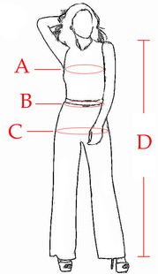 А: Обхват грудиB: Обхват талииC:Обхват бедер D:Длина