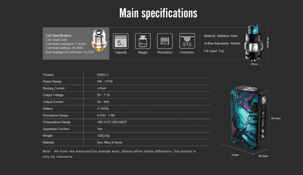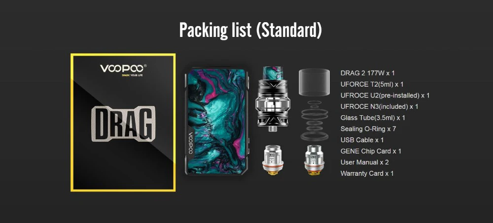 Описание продукта: Комплект VOOPOO Drag 2-это обновленная версия оригинального набора VOOPOO Drag, который состоит из боксмода Drag 2 и совершенно нового резервуара Uforce T2. В дополнение к его высококлассному техническому дизайну, который очень обтекается с красочной полимерной панелью с одной стороны, мод также выглядит современным. На контрольной поверхности Вы увидите кристально чистый OLED-дисплей с меню, в котором отображаются текущий уровень батареи, режим, сопротивление, напряжение и мощность. Самая большая изюминка заключается в том, что Мод выполнен с 32 бит нас ген весело чип от крупнейшего в мире поставщика электронных сигарет чипов. Питание от двойных батарей 18650, может включать выходную мощность до 130 Вт с атомайзерами, которые имеют сопротивление 157 Ом и до Вт, если сопротивление атомайзера составляет Ом или выше. Вы также можете настроить личное значение охлаждения катушки и коэффициент проволоки для того, чтобы достичь лучшего вейпинга. В сочетании с новейшим танком Uforce T2, он производит сильное облако и непревзойденный вкус! Параметры: Размер: 88,3*51*26,5 мм Материал: нержавеющая сталь + смола Диапазон мощности: 5-177 Вт Аккумулятор: 2 батареи 18650 (не входят в комплект) Рабочее напряжение: 6,4-8,5 в Рабочий ток: 1-40 А Диапазон выходного напряжения: 0-7,5 в Диапазон сопротивления: 0,05-3,0 (VW); 0,05-1,5 (TC) Резьба: 510 Набор для упаковки: 1 x мод VOOPOO Drag 2 (без батареи) 1 Емкость Uforce T2 1 х линия зарядки Micro USB 1 x Руководство пользователя