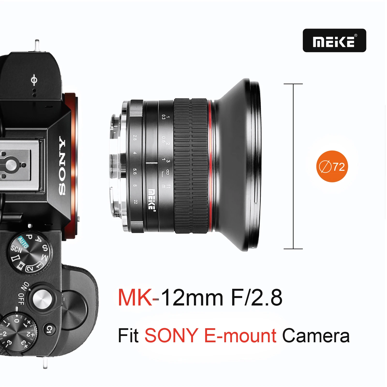 MEKE 12 мм f/2,8 Ультра широкоугольный фиксированный объектив со съемным капюшоном для Sony Alpha и Nex беззеркальной камеры с APS-CШирокоугольный объектив 12 мм F/2,8-это ручная большая апертура, применяемая в формате APS-C, сменные цифровые камеры объектива. Он применяется для крепления линз всех основных брендов, с полным объективом, изготовленным из пыли и паростойкого матового металла. Линзы изготовлены из многослойного нано-оптического покрытия, без бликов линз или нечетких изображений. Это лучший выбор для съемки фигурок, неподвижных фотографий и уличных снимков.Характеристики:Модель: объектив MK-12mm F2.8Тип объектива: ручная фокусировка широкоугольный фотографический объективСтруктура линз: 10 групп и 12 линзДиапазон диафрагмы: F2.8-22Фокусное расстояние: 12 ммДиаметр линзы: 78 ммРазмер фильтра: 72 ммУвеличение: 0,123x (1 км)Длина: 65,8 ммВес: 360 гПокрытие: многослойное покрытие по нанотехнологииУгол обзора: diagonal99 ¡горизонтальный 88,5 ¡вертикальный 65,5Посылка включает в себя:1 x Корпус объектива1 x специальная бленда1 x чехол для объективаЗадняя крышка-1 шт.1 х Передняя крышка1 х Салфетка для очистки линз1 гарантийный талон