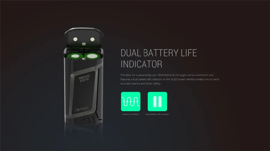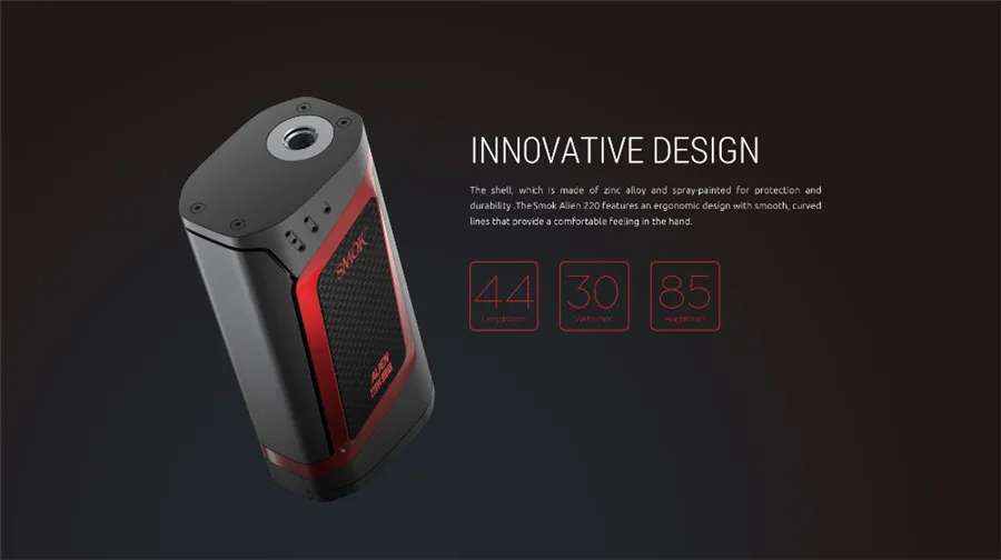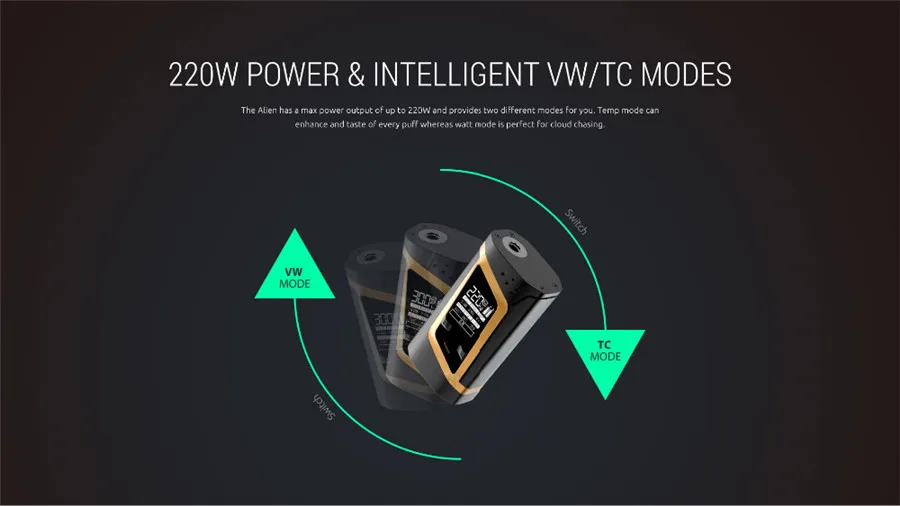Особенности: * 220 Вт Высокая мощность * Функция VW/TC * Обновленная прошивка * 3 мл мини размер * Переработанная Нижняя пара воздухозаборников, воздушная камера и капельный наконечник * Регулируемая система воздушного потока * Верхняя система пополнения Параметры: Размер модели: 85x44x28,4 мм Диапазон мощности: 1 Вт-220 Вт Диапазон сопротивления: 0.1Ω-3Ω (VW) / 0.06Ω-2Ω (TC) Диапазон температур: 200F--600F/100C--315C Материал: нержавеющая сталь Размер бака: 22x53 мм Емкость электронного сока: 3 мл Нить: 510 Тип батареи: два аккумулятора 18650 Упаковочный лист: 1 * Alien 220 Mod 1 * Детский бак TFV8 1 * V8 Baby-Q2 ядро (0.4Ω двойные катушки) (предустановленный) 1 * V8 Baby-T8 ядро (0,15 Ω octuple катушки) 1 * USB кабель для зарядки/обновления 1 * сменная стеклянная трубка 1 * Руководство пользователя Запасные части