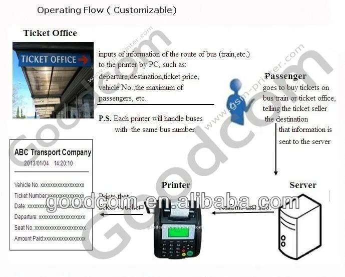 3) проводник выбирает начальную/конечную станцию, автобусный билет будет распечатан автоматически, затем принтер отправит обратный вызов на сервер.