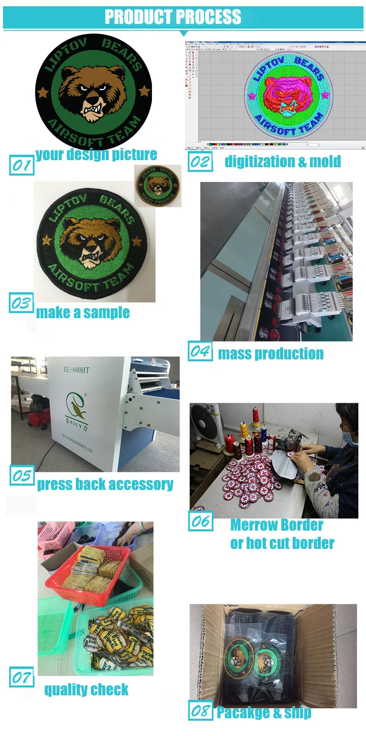 В1: я никогда раньше не заказывал нашивки. Как мне начать? О1: это легко. Пожалуйста, пришлите нам свой дизайн и сообщите нам, сколько патчей вы хотите заказать. В2: Как я могу отправить вам дизайн? О2: вы можете отправить онлайн или отправить по электронной почте. Мы принимаем форматы файлов ai, psd, jpg, pdf, doc и других. В3: какой у вас Минимальный/максимальный заказ? О3: у нас нет минимального или максимального заказа. Когда вы заказываете через нас, мы можем сделать как можно меньше или столько пластырей, сколько вам нужно. В4: какое у вас обычное время оборота? Ответ 4: обычно среднее время обработки составляет 1,5-2 недели, но для большого количества заказов и уникального продукта может потребоваться больше времени. Не стесняйтесь отправить нам дизайн для оценки. Срочный сервис доступен по запросу. В5: сколько цветов я могу выбрать для нашивки с вышивкой? И как мне выбрать цвета? Ответ 5: вы можете выбрать 9 цветов для вашего дизайна вышивки. И вы можете ознакомиться с нашими онлайн-таблицами цветов, чтобы выбрать свой цвет. В6: смогу ли я увидеть образец пластыря перед их изготовлением? Ответ 6: Да, мы отправим вам образец изображения для утверждения перед производством с каждым фирменным заказом. Вопрос 7: Какие способы оплаты вы принимаете? О7: Мы принимаем онлайн-платежи, Paypal, кредитные карты и другие В8: стоимость доставки кажется дорогой. О8: если вы чувствуете, что доставка слишком высока, пожалуйста, сообщите нам. Мы дадим вам другие предложения от другой транспортной компании. Советы: Все изображения представлены здесь только для справки, но не для продажи. Пожалуйста, напишите нам ваш патч с изображением, размером, количеством и более подробной информацией, чтобы мы могли указать точную цену. P.S файл художественных работ лучше быть в формате jpg, png или psd.