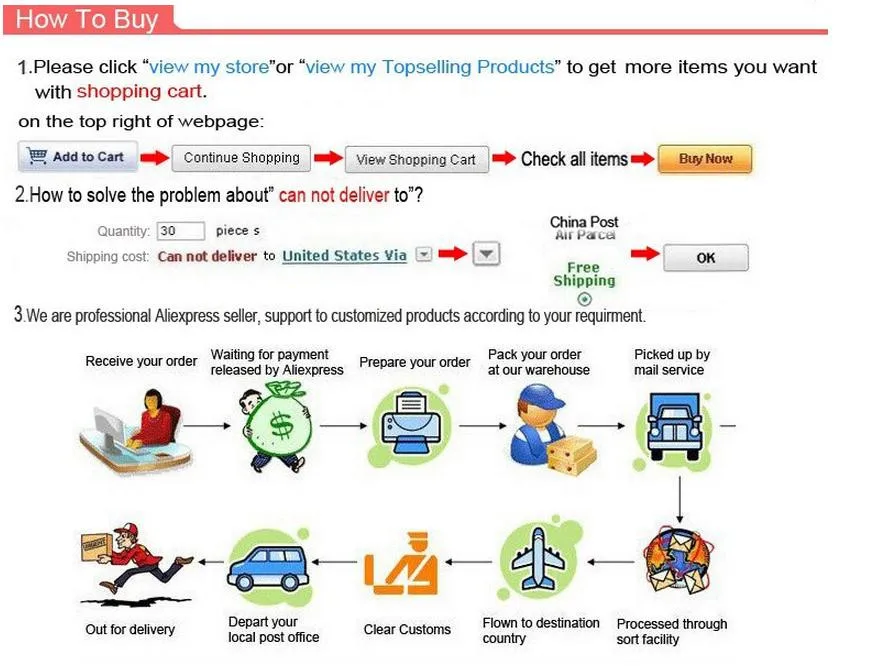 Информация о доставке1. Мы можем отправить посылку заказной почтой Китая или Авиапочтой Гонконга, e-Packet,China Express или China EMS,DHL,Fedex,UPS...2. Большинство стран могут получить посылку в течение 15-35 рабочих дней с доставкой через China Registered Mail Post или HongKong Registerd Post Air Mail или e-Packet.3.DHL,Fedex,UPS доставка может доставить посылку в течение 1-8 рабочих дней для большинства стран.4.EMS доставка обычно занимает 7-15 дней в рабочих днях, (дата доставки сделки зависит от экспресс-доставки клиента в собственной стране).5.POS Малайзия доставка и Почта Китая обычный маленький пакет плюс оба без отслеживания информации.6. Если вы не получили свою посылку в течение 30 дней после отправки посылки, пожалуйста, свяжитесь с нами. Мы Отследим доставку и свяжемся с Вами как можно скорее с ответом. Наша цель-удовлетворенность клиентов!7. Импортные пошлины/налоговые сборы/сборы не включены в цену товаров или стоимость доставки, эти сборы являются ответственностью покупателей.8. Все заказы обычно могут быть отправлены в течение 3 рабочих дней после получения оплаты.