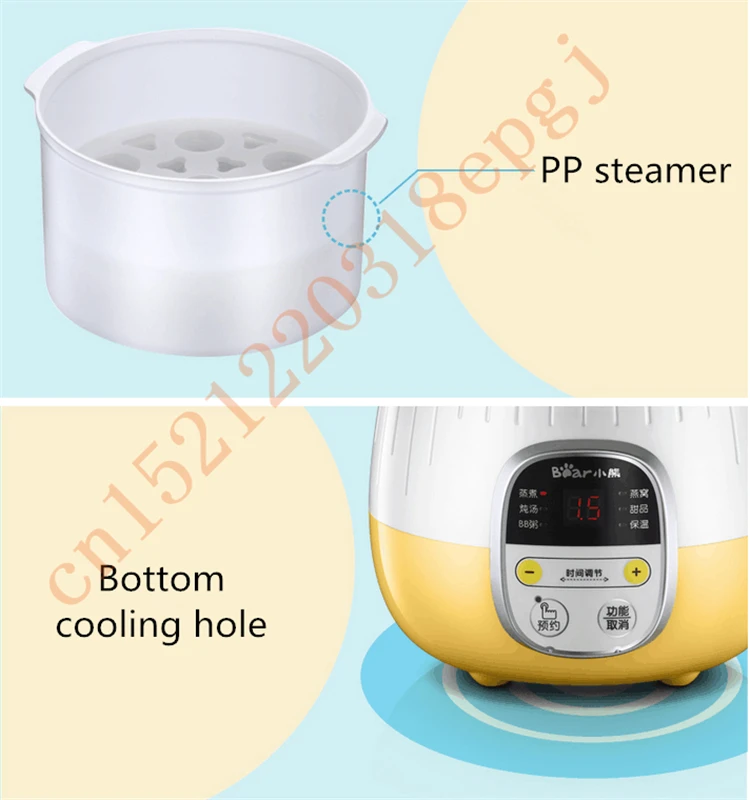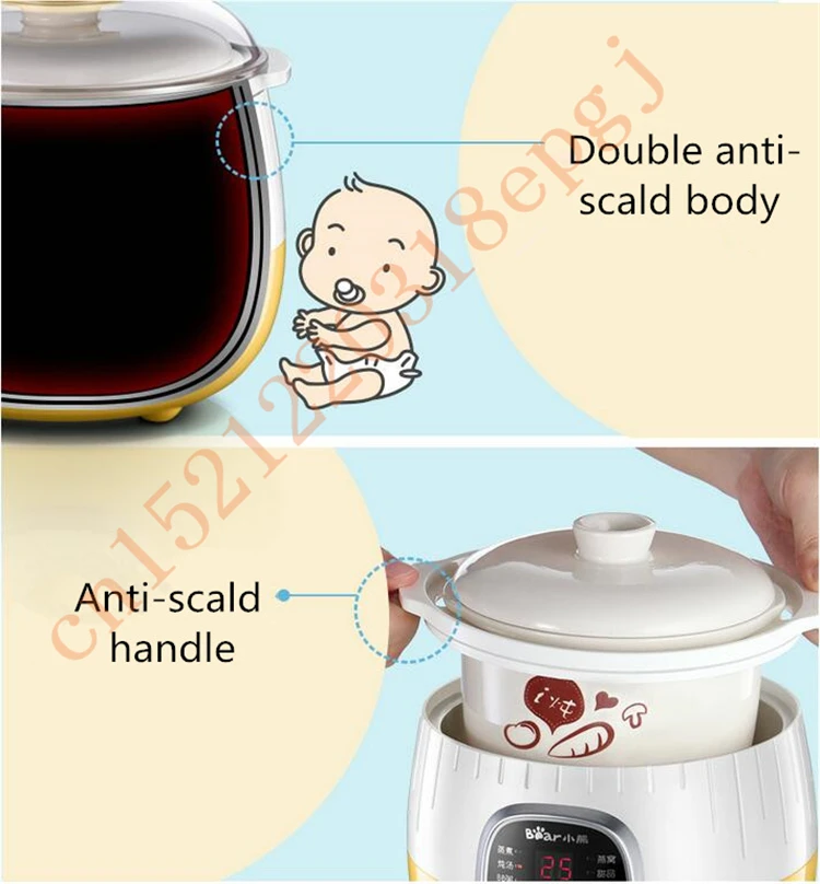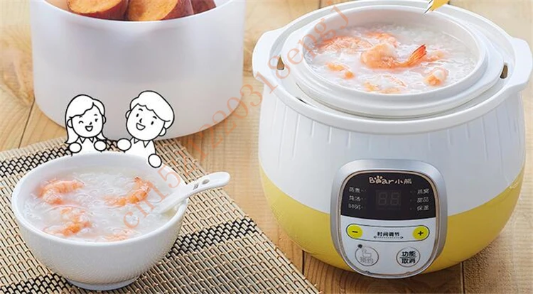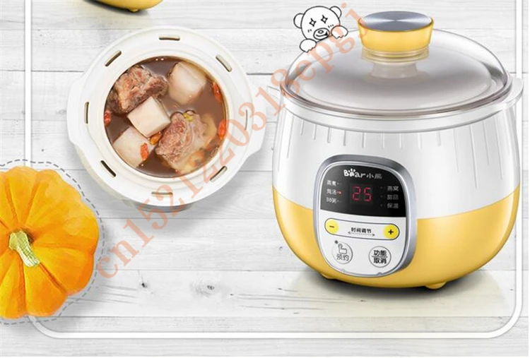 Напряжение: 220 ВМощность: 200 ВтОбъем внутреннего мочевого пузыря: 0,8ЛЕмкость отпаривателя: 1лПреимущества продукта:1.9.5 часовая функция резервации2,6 большой тушеного мяса функции3. Двойной режим изоляции4. Медленное тушение воды и Блокировка питания пищи5. Двойной слой анти-горячий горшок тела6.PP пароварка, безопасность и здоровье7. Нижняя охлаждающая отверстие для продления срока службы машины