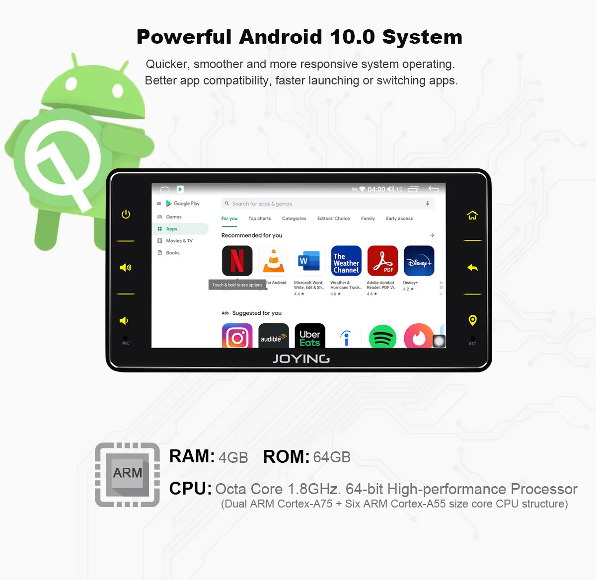 1. ОС: Android 10,0 2. Процессор: UIS7862 восьми-ядерный 1,8 ГГц двухъядерный процессор ARM Mali G52 614,4 МГц 3. ОЗУ: 4 Гб; ПЗУ: 64 Гб. 4. Подключение телефона: для iPhone, вы можете подключить Carplay и Android auto через bluetooth или USB кабель, он поддерживает iOS13 или более низкую версию iPhone. Для телефона android, вы можете подключить android auto с помощью usb-кабеля, он поддерживает android 10,0 или более низкую версию телефона. 5. Интернет: вы можете подключить sim-карту непосредственно к Интернету для серфинга, пожалуйста, отключите PIN-код sim-карты на вашем смартфоне перед использованием. Вы также можете использовать ваш смартфон поделиться Wi-Fi точка доступа к Головному Устройству. Он поддерживает 5G 5G Гц WIFI 6. Gps-навигация: он поддерживает GPS и ГЛОНАСС, поставляется с автономными картами, вы также можете установить другие карты. 7. Версия Bluetooth 5,1, поддерживает bluetooth телефонные звонки и музыку. 8. Головной блок поставляется с ISO жгутом, есть KEY1 и KEY2 на жгуте, они являются проводами управления рулевого колеса, если ваш автомобиль не имеет Can-Bus, вы можете узнать, что провода управления рулем вашего автомобиля подключаются соответственно, тогда кнопки управления рулем вашего автомобиля будут работать хорошо. 9. Поддержка обратной камеры/фронтальной камеры/OBD2/TPMS/DAB +, вам нужно купить отдельно. 10. Чип усилителя: TDA7851. Радио чип: TDA7786 Чип DSP: ROHM32017. Новый JOYING блок теперь поставляется с оптическим SPDIF цифровой аудиовыход * коаксиальный цифровой выход. Для максимального качества звука вы можете напрямую подключить внешний усилитель/DSP к цифровому выходу SPDIF; Если ваш внешний усилитель/DSP не поставляется с входом SPDIF, вам нужно будет подключить усилитель/DSP через FL/FR out & RL/RR out.