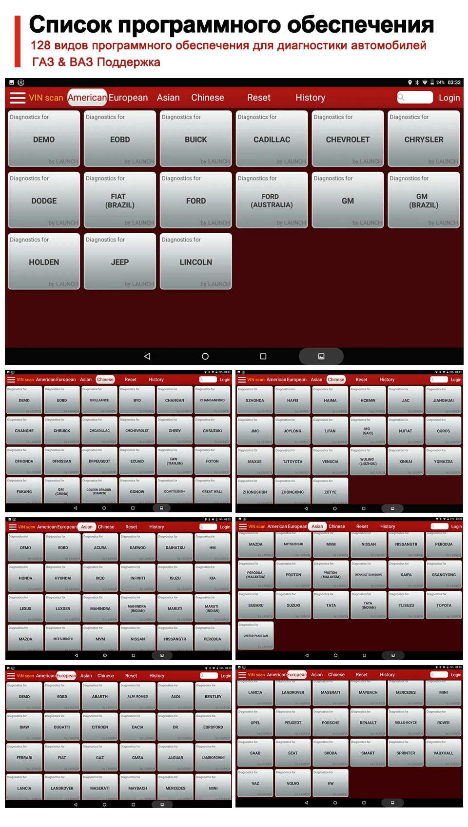 -Американские автомобили Бьюик; Кадиллак; Шевроле; Крайслер; Dodge; Форд; GM; Хаммер; Джип; Линкольн; (БРАЗИЛИЯ) BX-Fiat; BX-GM -Европейские автомобили: Abarth; Альфа-Ромео; Audi; Бентли; Бенц; БМВ; Бугатти; Ситроен; Дачия; ЕС-Форд; Феррари; Fiat; Ягуар; Ламборджини; Lancia; Land Rover; Мазерати; Maybach; Мини; Опель; Пежо; Порше; Renault; Rolls-Royce; Ровер; Saab; Сиденье; Шкода; Умная; Спринтер; Воксхолл; Volvo; VW; (УКРАИНА) ЗАЗ; (РОССИЯ) ГАЗ; ИЖ; ПАЗ; SEAZ; УАЗ; ВАЗ -Азиатские автомобили (ЯПОНИЯ) Acura; Daihatsu; Хонда; Infiniti; Isuzu; Jpisuzu; Лексус; Mazda; Mitsubishi; Nissan; Nissan GTR; Отпрыск; Субару; Субару; Сузуки; Тлисузу; Toyota; (КОРЕЯ) Daewoo; Hyundai; KIA; Samsung; Ssangyong; (КИТАЙ) Baic; Пекин; Чанган; Чанган-Форд; Чанчэн; Чанхэ; Чсузуки; DF Peugeot; DF Honda; DF Nissan; DF XK; Флаер, BYD; Фуканг; Futian, Foton; Geely; Гонов; GZ Honda; Хафей; Хаоцин; HC BMW; Хмада; Хуачен; Isuzu, JMC; Джакти; Цзянхуай; Цзяо; Цзиньлун; Джойлонг; Лифан; Liuwel-TY; Люксген; Нью-Джерси Fiat; Qirul-TY, Chery; Корос; Saicmg; Spark-TY; TJ Toyota; Trumpchi GAC; Вейли; Сяокан Дунфэн; Ксили, Фао Тяньцзинь; Синкай; YQ Mazda; Чжуншунь; Чжунтай, Зотье; Чжунсин; (ИНДИЯ) Махиндра; Марути; Тата; (МАЛАЙЗИЯ) Perodua; Протон; (ИРАН) MVM -Австралийские автомобили Au-Ford; Холден
