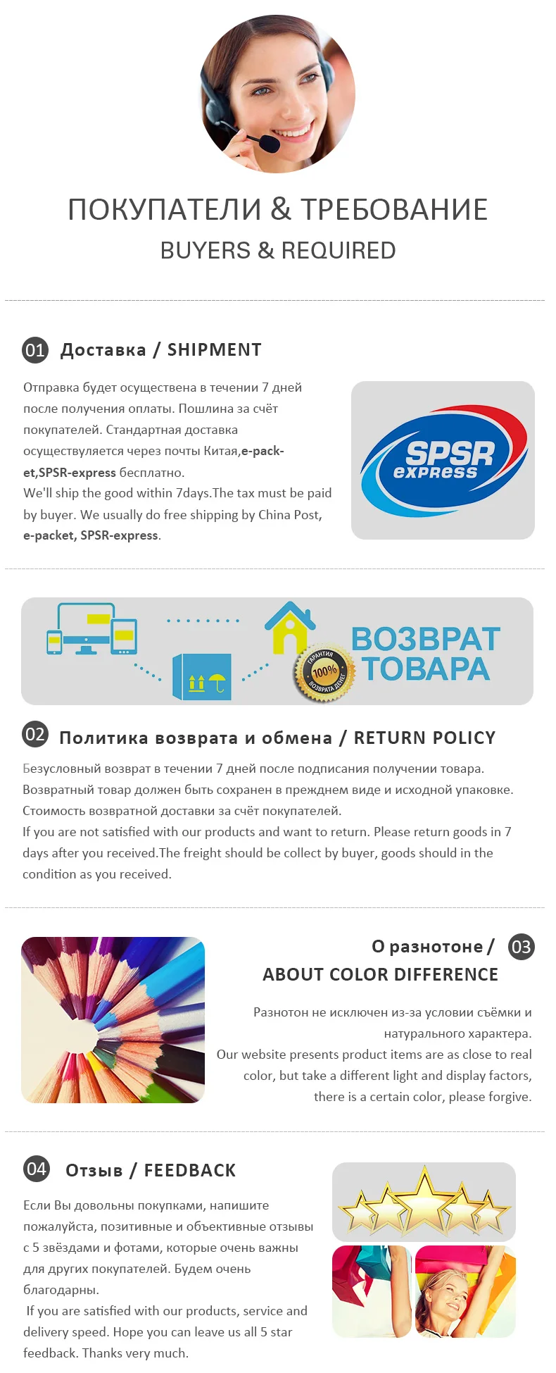 Абсолютно вся доставляемая нами продукция имеет отличное качество и проходит строгую проверку Перед отправкой. Мы постараемся сделать все возможное, чтобы избежать любой проблемы качества. О Отзывы: Мы зависим от вашего удовлетворения, чтобы добиться успеха, поэтому отзывы очень важна для нас, пожалуйста, оставьтеХороший отзывыЕсли вы удовлетворены нашими товарами и услугами, мы сделаем это и для вас.Спасибо большое! Прежде чем оставлять негативный отзыв или открывать спор на сайте Aliexpress, свяжитесь с нами по электронной почте. Мы гарантируем, что ответ вас обрадует!О цене: