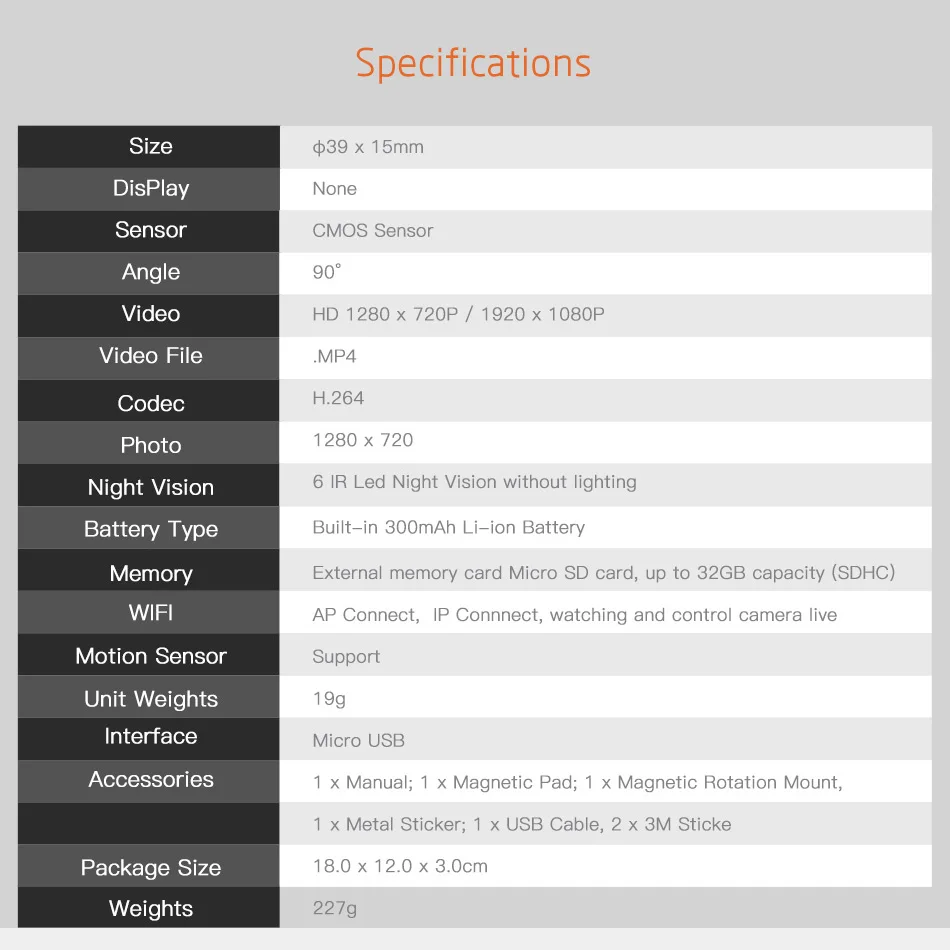 | 1. Меньше всего: Φ39*15,9 мм с магнитом и специальными аксессуарами, C2 может работать как камера безопасности, носимая камера тела, автомобильная камера... | ||||||||||