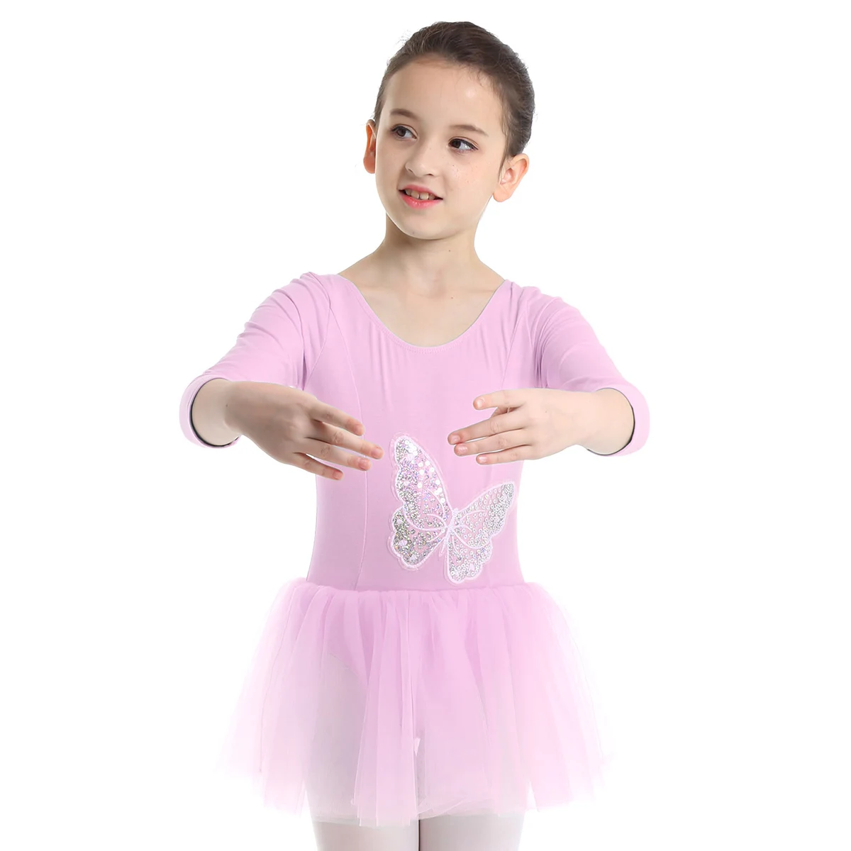 Длинные рукава, круглый вырез, впитывающий пот хлопковый купальник украшен блестками и аппликацией в виде бабочки.