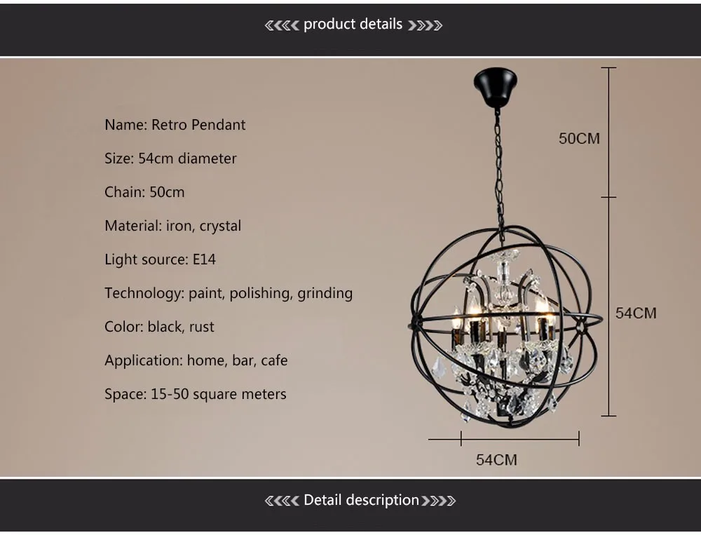 Параметры продукта: 1. [Напряжение] : AC85-265V 2. [цвет корпуса]: цвет ржавчины/черный цвет 3. [Основные Материалы]: металл + стекло + кристалл 4. [регулировка яркости]: Нет 5. [излучающий цвет]: теплый белый 6. [применение]: спальня/гостиная/столовая/кухня/Гостиница
