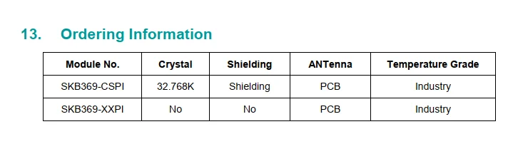 В SKB369-это высоко интегрированный Bluetooth 4,2 BLE модуль, конструкция устройства позволяет ему двигаться с высокой скорости передачи данных, ближней беспроводной связи в 2,4 GHz ISM полоса. Кроме того, SKB369 поддерживает протокол ANT. Модуль основан на Nordic nRF52832 радио приемопередатчик, имеет 32 бит ARM Cortex-M4F Процессор, флэш-памяти и аналоговый и цифровой периферийных устройств. SKB369 обеспечивает низкую мощность и сверхнизкую стоимость BLE решение для приложений беспроводной передачи. SKB369 также имеет NFC-A интерфейс для сопряжения OOB.