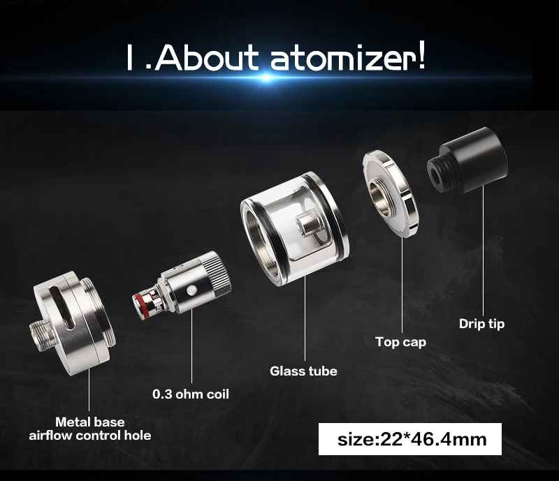 Материал: 304 нержавеющая сталь Размер: 46,4 мм (длина) * 22 мм (диаметр) Емкость бака: 2 мл Стекло трубки 0,3 Ом катушка Внутренний фитиль, 100% органический хлопок в катушке Специальная внутренняя конструкция для предотвращения утечки жидкости Воздушный поток Управление Изолированный Пластик съемный наконечник для капель Suppor мощность 30-60 Вт Вес нетто: 42 г