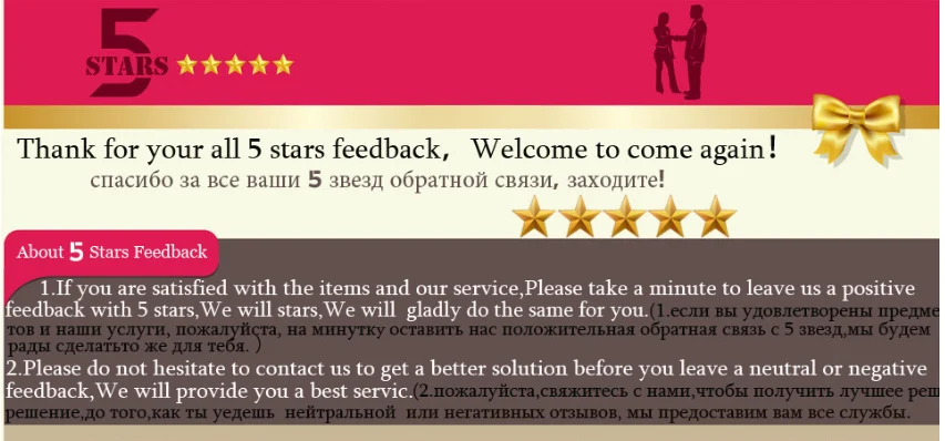 Мы фокусируемся на электронных сигаретах, электронных продуктах кальяна, 100% удовлетворение является нашей основной целью. Поэтому ваши отзывы очень важны для нас. Если вы удовлетворены нашими товарами, пожалуйста, оставьте 5 звезд отзывы. Пожалуйста, свяжитесь с нами, прежде чем оставить 1-3 звезды отзывы, мы поможем вам решить вашу проблему вовремя.