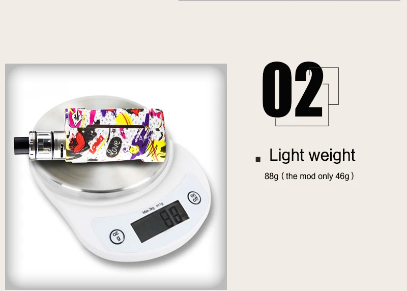 Размер: 40 мм (длина) * 25 мм (ширина) * 82 мм (высота) Вес нетто: 46 г Материал: АБС-пластик Мощность: 90 Вт (макс.) Нить: 510 Диапазон напряжения: 3,3-4,2 в Выходное напряжение: 0-4,2 в Сопротивление катушки:> = 0.09ohm Непрерывное время вейпа: 10 секунд Ток бездействия: <5μA Перезарядки ток: 750mA