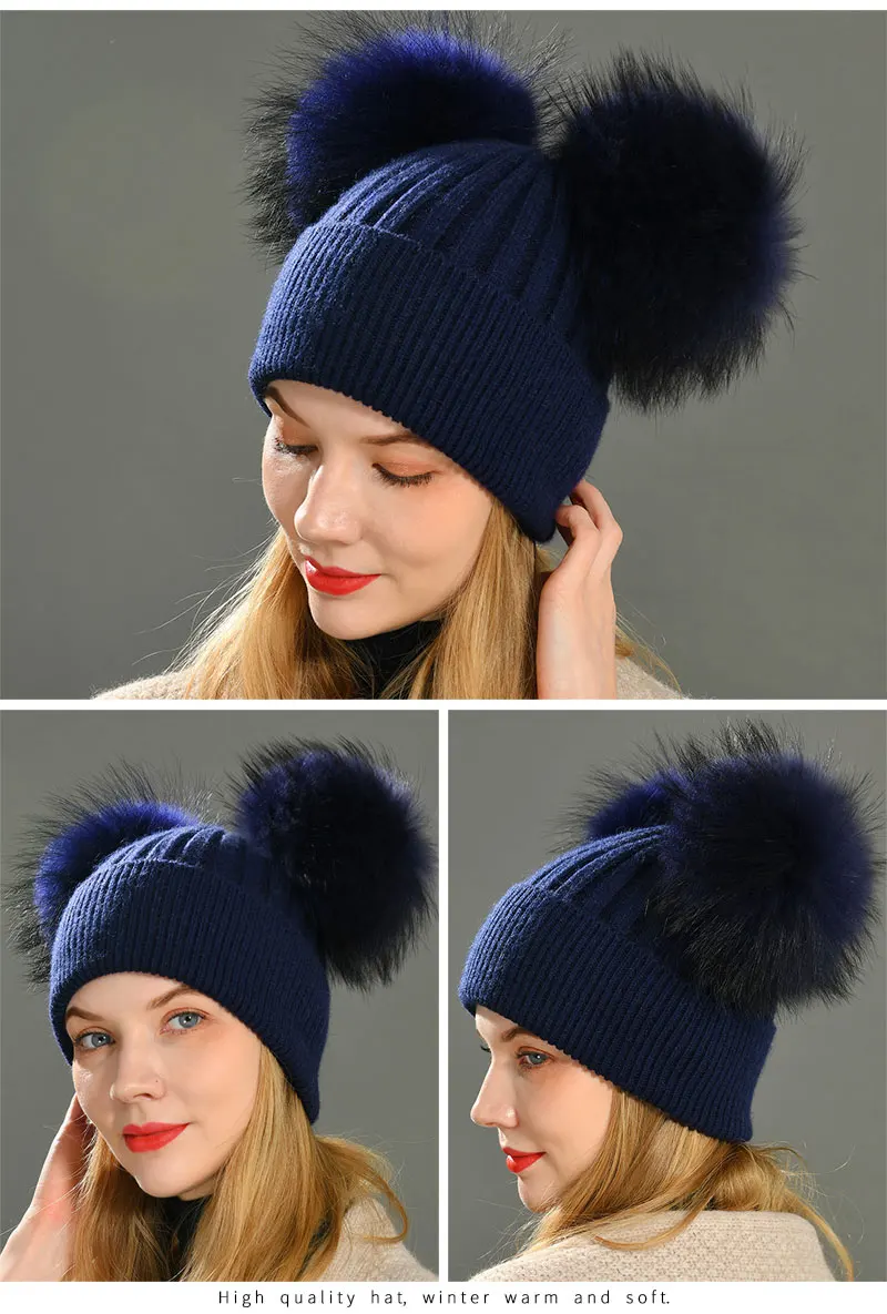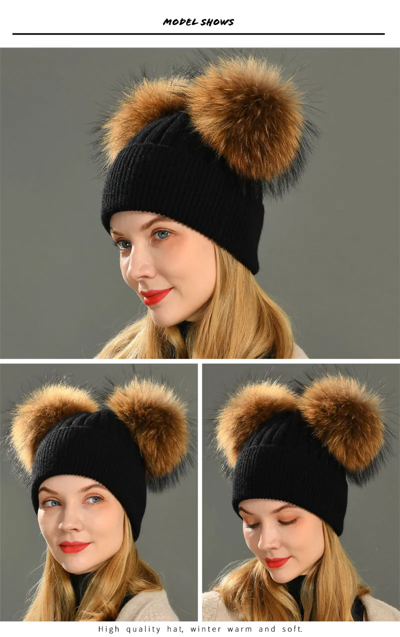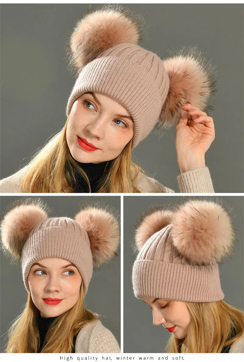 Зимняя шапка бини из натурального меха для женщин, женская двойная шапка с помпоном из натурального меха енота, Вязаная Шапка-бини с 2 меховыми помпонами