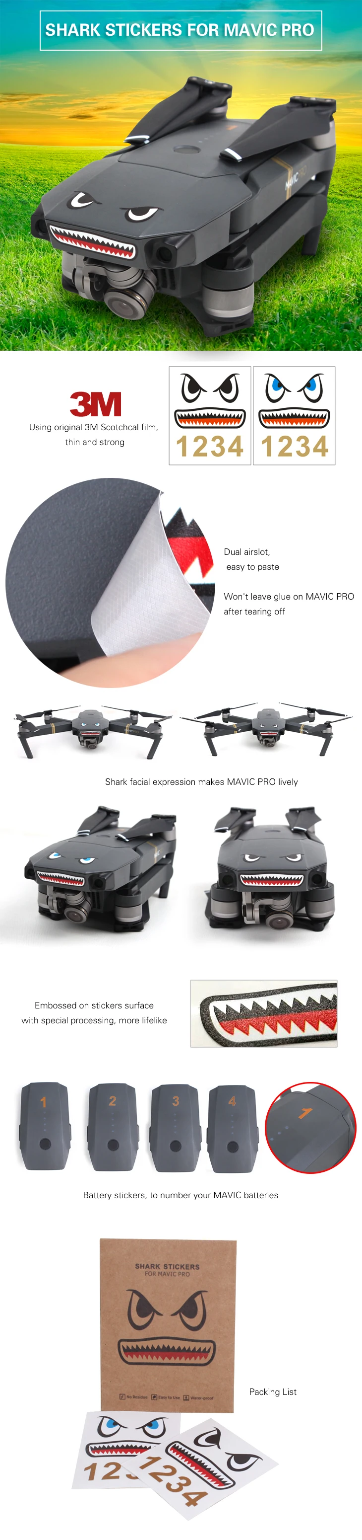 3 м наклейки 2 шт. наклейки на лицо акулы для DJI Mavic Mini 2/Mini/MAVIC AIR 2/MAVIC 2/MAVIC PRO/Mavic Air/DJI Spark стикеры DIY аксессуары