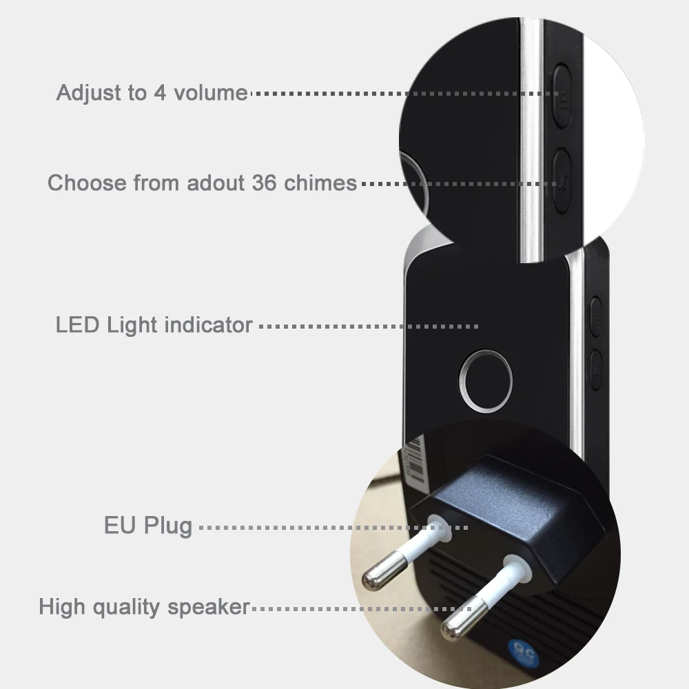 1. Кнопка поддерживает до 6 шт., а приемник поддерживает до 100 шт. 2. Передатчик не имеет винтового патрона, он может быть водонепроницаемым и пыленепроницаемым без резинового кольца. 3. Передатчик использует щелочную батарею 23A12V (аккумулятор в комплект не входит). 4. Напряжение приемника: 110-220 В. 5. Приемник доступен в различных вилках, штепсельных вилках США/ЕС/Великобритании и адаптерах Австралии, подходит для большинства стран. 6. Расстояние приема: 300 метров на открытой местности. 7. На беспроводной сигнал будут влиять препятствия. Чем больше препятствий, тем серьезнее потеря сигнала. 8. Приемник имеет 4 уровня 20-80 дБ, 36 музыки на выбор. 9. Размер: передатчик 77x46x20 мм, приемник 90x56x20 мм. Примечание: кнопка не может быть размещена на железной двери, потому что это будет мешать сигналу.