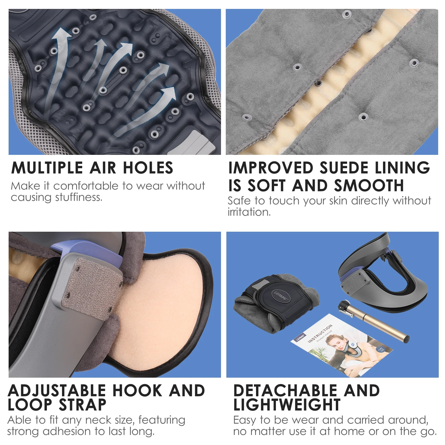 LEAMAI работает над шейным воротником в течение многих лет. Мы продолжаем улучшать наш продукт, чтобы предоставить клиентам лучший сервис. Этот продукт поможет людям эффективно облегчить боль и давление на шею и плечо. Материал был тщательно выбран нами, так что продукт может достичь наилучшего эффекта и клиенты могут чувствовать себя более комфортно.