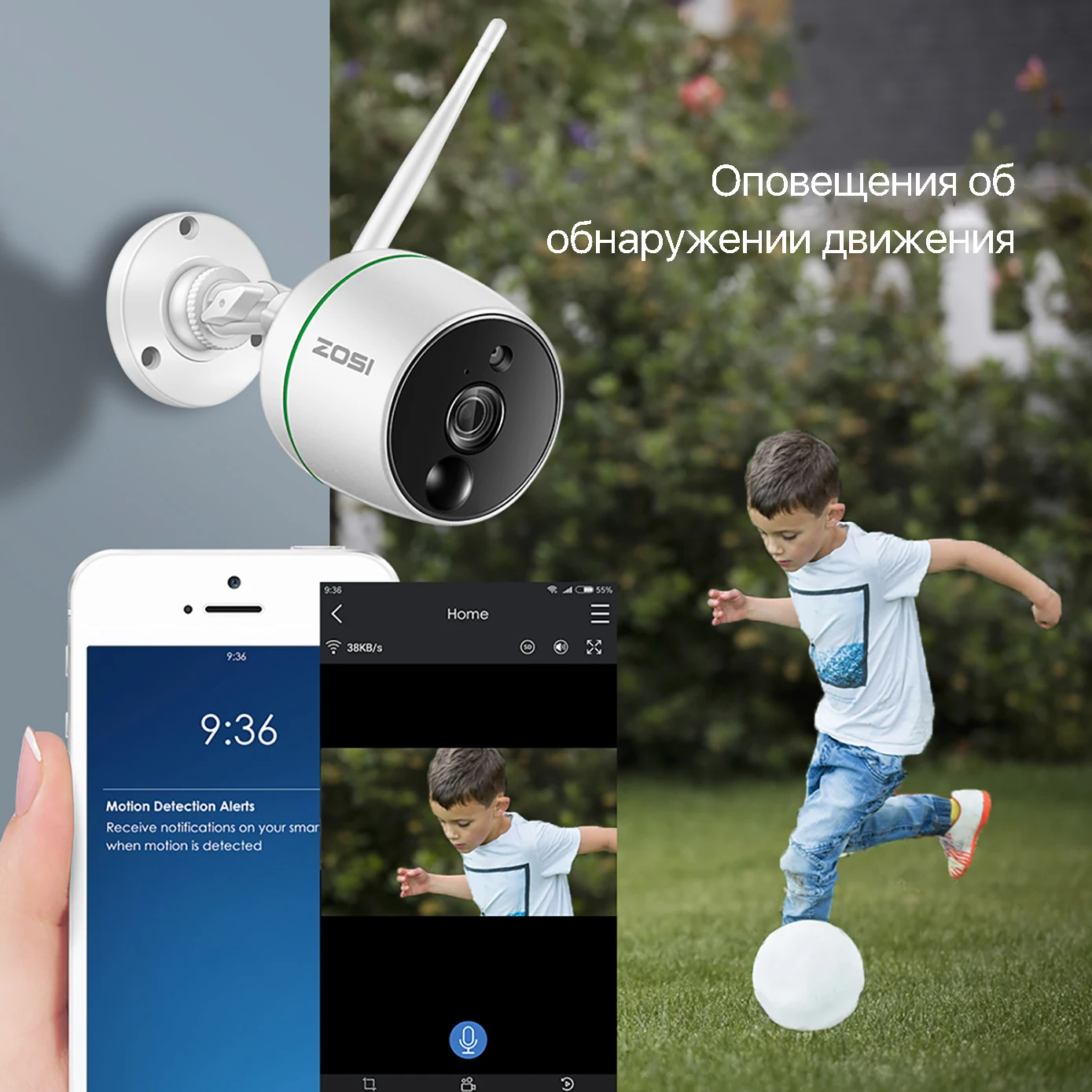 Датчик обнаружения движения PIR: датчик движения PIR уменьшает ложные сигналы тревоги, срабатывает при обнаружении тепла и движения, камера мгновенно отправляет уведомление на ваш смартфон.Простая настройка и удаленный обзор - загрузите приложение ZOSI pano из App store или Google Play, подключите камеру к источнику питания(примечание: камера не работает от аккумулятора).Подключите камеру к Wi-Fi, затем вы можете просмотреть зображение с камеры с помощью приложения ZOSI pano или программного обеспечения ПК.