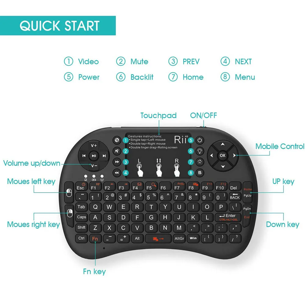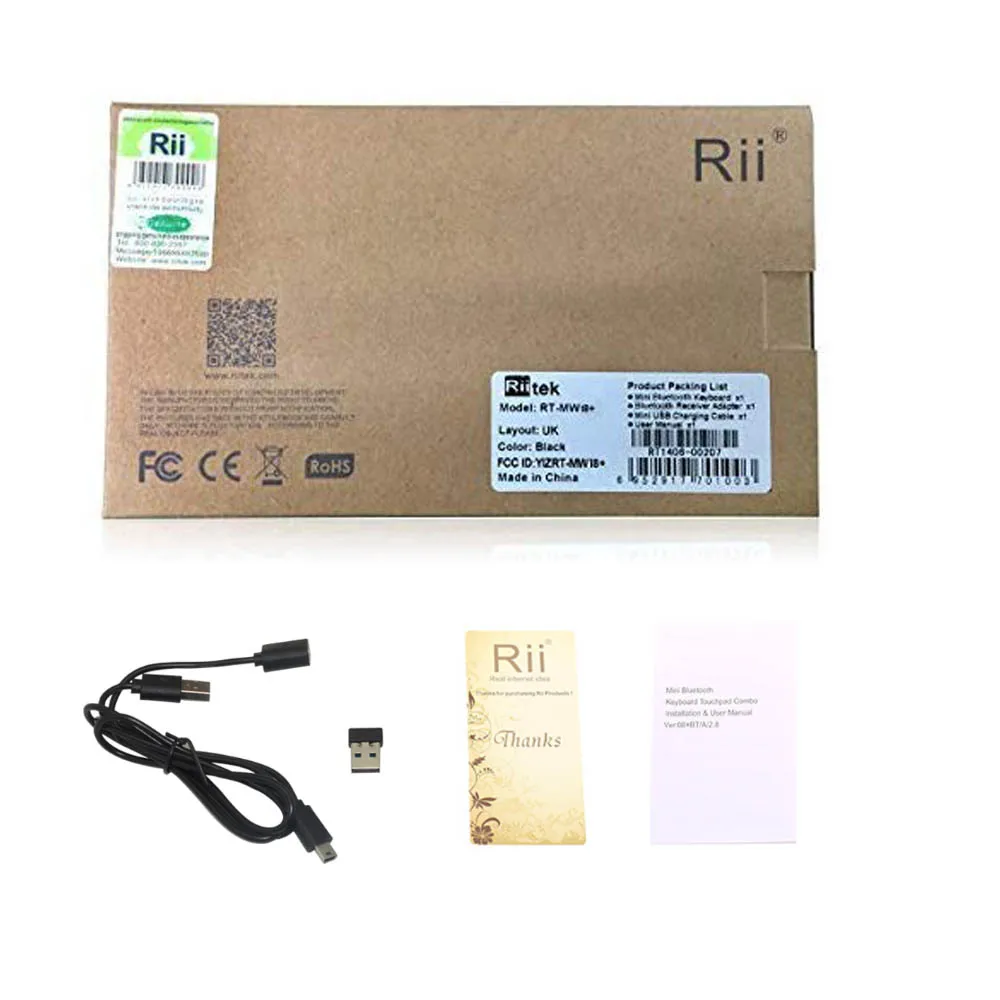 Highlights основные моменты 】 -Беспроводная клавиатура с сенсорной панелью на 2,4 ГГц и беспроводной клавиатурой с сенсорной панелью на радиочастоте 2,4 ГГц. -Rii mini i8 + с английским/русским/испанским языком, с высоким качеством. USB wifi передатчик кабель свяжитесь с компьютером, ноутбуком. Вы больше не можете полагаться на клавиатуру. Следуйте своим наклонениям дивана, компьютерная работа. -Сенсорная панель DPI обеспечивает регулируемые функции. -Встроенный высокочувствительный умный тачпад с поворотом на 360 градусов. -Mini QWERTY-клавиатура с мультимедийными кнопками управления и кнопками управления для ПК. -Режим автоматического сна и автоматического пробуждения. -Инновационная форма, портативная, элегантная. -Эргономичный ручной дизайн прост в переноске и эксплуатации. -Идеально подходит для ПК, Pad, android TV Box, Google TV Box, system/IP TV и т. Д. -Встроенный Съемный перезаряжаемый литий-ионный аккумулятор, который имеет более длительное время работы в режиме ожидания. Примечание: -FN + F8 Функция: открыть/закрыть двойной палец -Usb-кабель предназначен только для зарядки, он не может связаться с компьютером, если вам нужно использовать смартфон с помощью кабеля OTG -Когда Rii mini i8 + работает на ТВ-коробке, клавиша быстрого доступа, т. Е. Не работает, может нормально работать на компьютере 【 Характеристики 】 -Тип батареи: встроенный литий-ионный аккумулятор -Энергопотребление: 55 мА (вкл.), 1 мА (спящий режим) -Размер изделия: 15x10x2 см -Вес изделия: 109 г -Размер посылка: 17x14,5x3,5 см -Вес посылка: 200 г -Цвет: черный -Требования к компьютерной системе: Windows 2000, XP, Vista CE,7 / Linux 【 Упаковка 】 -Беспроводная Клавиатура Rii mini i8 +-1 шт. -1 беспроводной приемник -Зарядный кабель-1 шт. -Руководство пользователя-1 шт. 【 Изображения 】