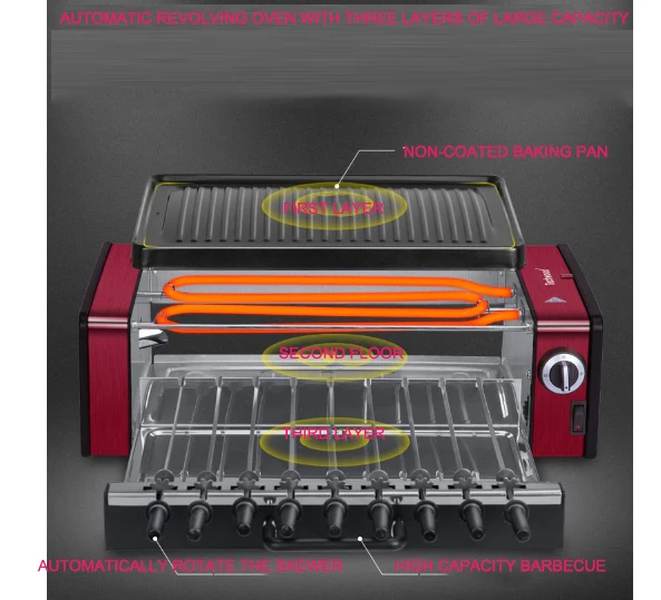 0-230 градусов свободный контроль температуры, кнопка автоматического поворота, нагревается равномерноАвтоматическая Вращающаяся печь с тремя слоями большой емкости, Корейская электрическая сковорода-гриль для барбекю, бездымный бытовой горшок для сладкого картофеля