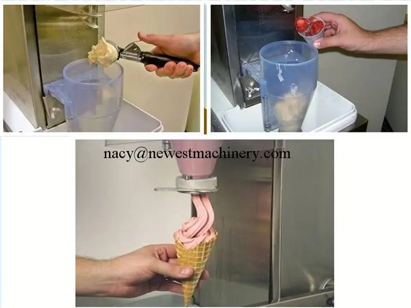 (1) достичь мороженого и фруктов, орехов, молочных коктейлей, идеальное сочетание для создания большего разнообразия Натуральные фруктовые ароматы мороженого. (2) с ручным управлением, для облегчения гнездования фруктов дробления и регулировки скорости. (3) Очистка струей, готовая к использованию эффективное решение для мороженого в процессе производства различных фруктов и проблем с запахом. (4) Оснащен системой сигнализации о переливании воды, что позволяет пользователям узнать резервуар для воды, заполненный водной ситуацией. (5) Спиральные смешивающие лезвия, дно смесительной головки с удобным разрывом замороженных фруктов. (6) размешать воронкой под крышкой, в зависимости от формы шляпы можно играть различные формы фруктового крема.