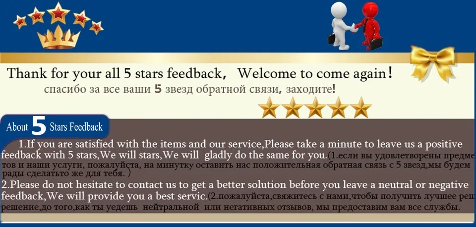 Пожалуйста, оставьте нам 5-звездочный DSR рейтинги в том случае, если вы удовлетворены нашими товарами и услугами. Ваши отзывы очень важны для нас, и мы надеемся, что вы оставите нам положительные отзывы. Мы также оставим вам отличные отзывы.