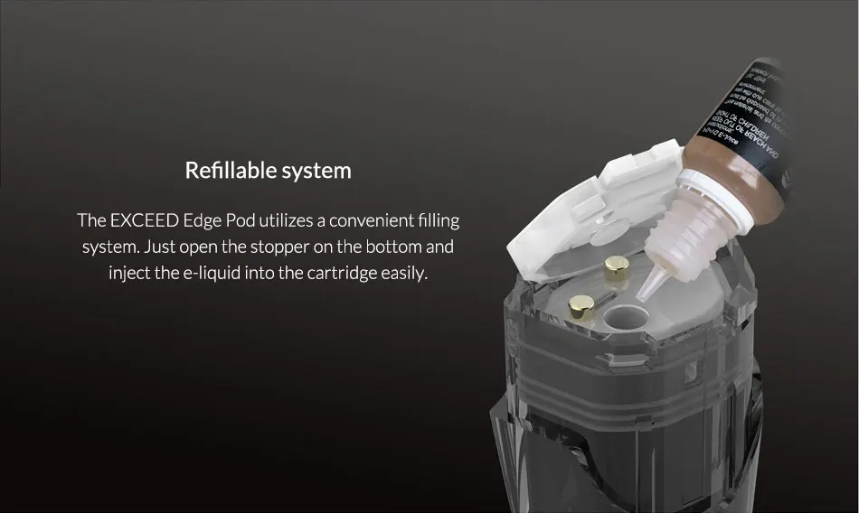 Pod EXCEED Edge использует удобную систему подачи документов. Просто откройте пробку в нижней части и легко вставьте e-жидкость в картридж.