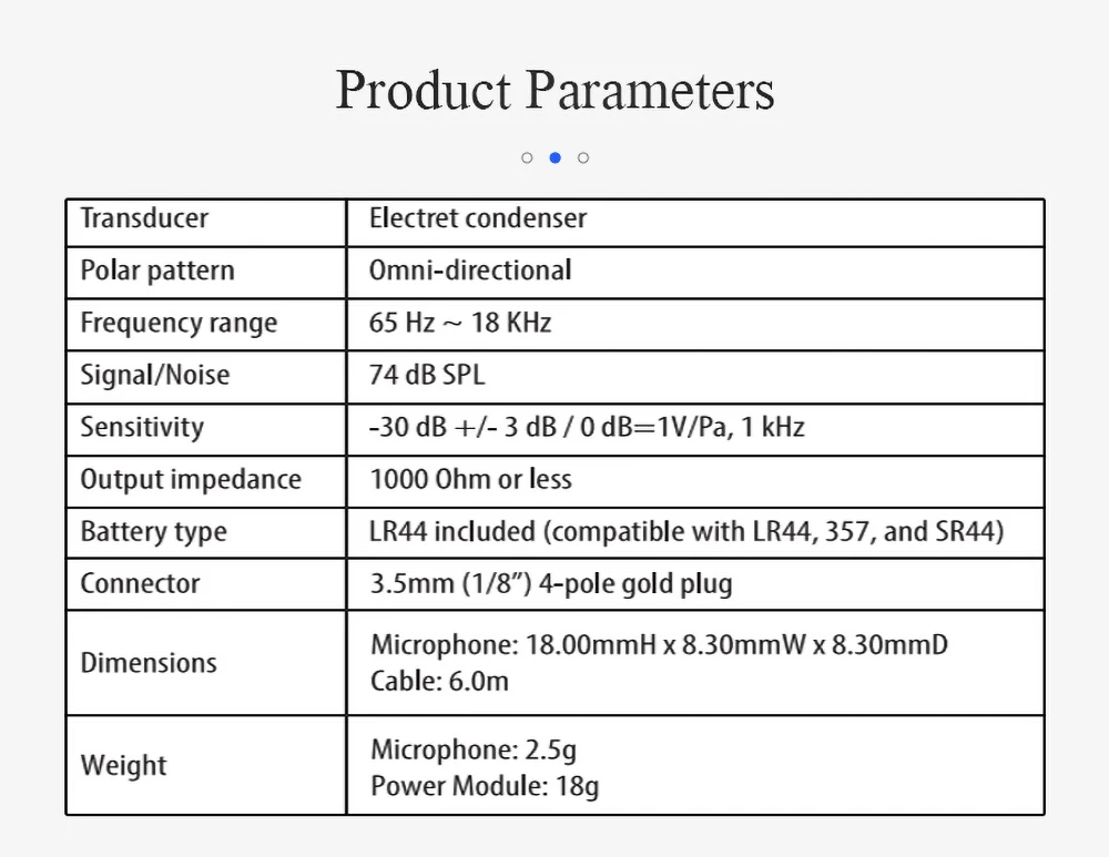Преобразователь: конденсатор Electret Полярный узор: всенаправленный Частотная характеристика: 65 Гц-18 кГц Сигнал/шум: 74 дБ или более Выходное сопротивление: 1000Ω или меньше Требования к питанию: LR44 в комплекте (совместим с LR44, 357 и SR44) Разъем: 3,5 мм (1/8 ”) 4-х полюсной золотистой вилкой Размеры микрофона: 18 мм x 8,3 мм x 8,3 мм Длина кабеля: 6 метров Вес: 3,5 г Вес модуля питания: 18 г