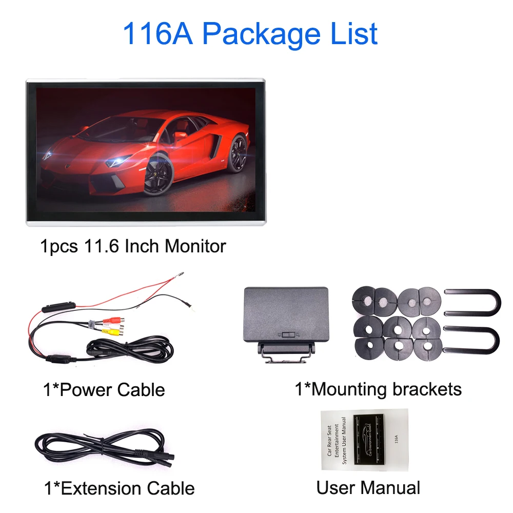1x 11,6-дюймовый автомобильный монитор в подголовнике 1x установить кронштейн 10x установить аксессуары 1x удлинитель кабельной линии 1x силовой кабель 1x английское меню пользователя 1x 1,0 м / 1x 2,0 м линия HDMI (при выборе цены с HDMI) 1x беспроводные наушники Bluetooth (при выборе цены с наушниками)