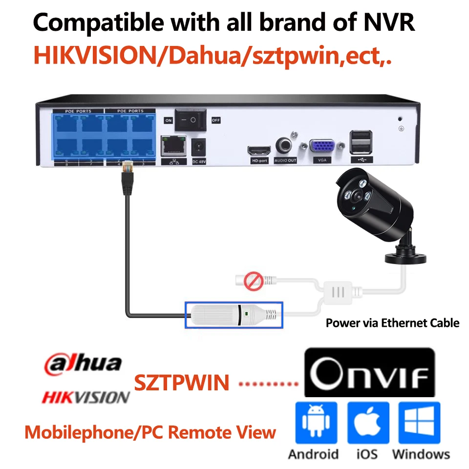 Простота установки POE, простота установки:Питание через Ethernet означает, что ip-камеры подключаются к NVR с помощью кабеля Ethernet, который передает данные и питание, нет необходимости подключать кабель питания, нет необходимости подключать проводник, более низкий риск утечки электричества и легко настроить. Экономьте время установки и сокращайте затраты.