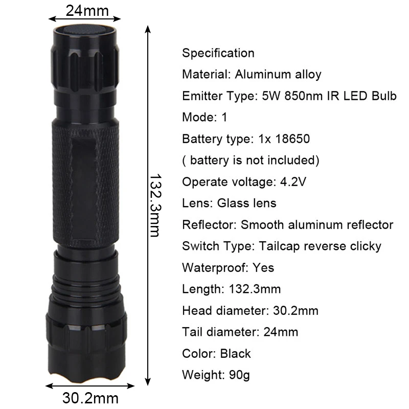 1 * 850nm светодиодный фонарик 1 * аккумулятор 18650 1 * зарядное устройство 1 * дистанционный переключатель давления 1 * держатель (как на ваш выбор)