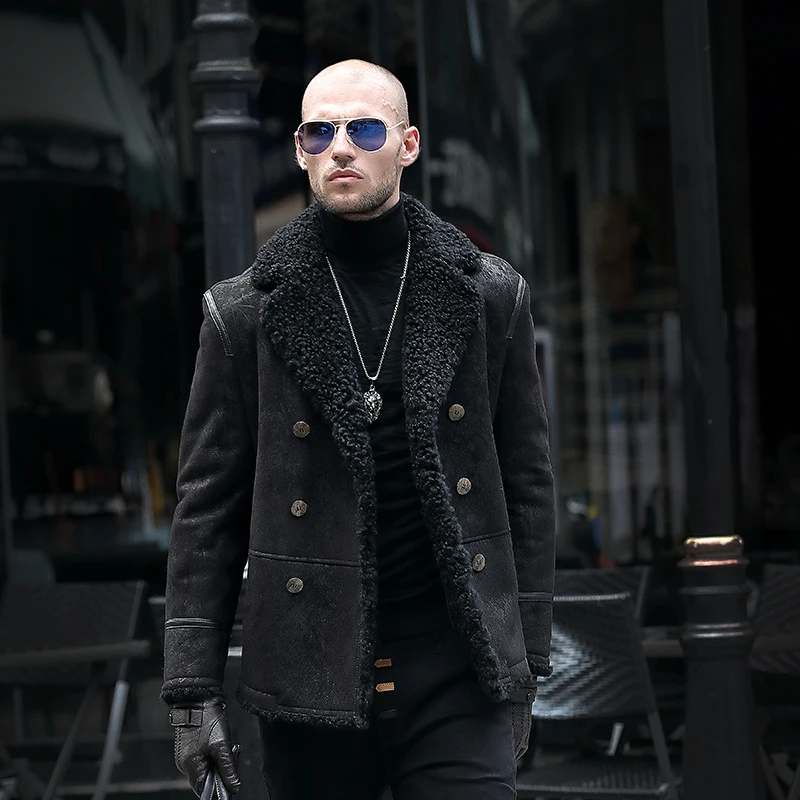Мужское зимнее толстое меховое кожаное пальто, мужская куртка из овчины с двойным воротником, высококачественный мужской костюм из меха локомотива