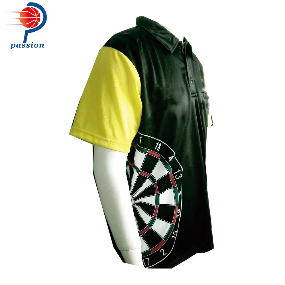 Черно-желтые футболки-поло с сублимационной печатью и дротика с нагрудным карманом