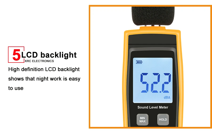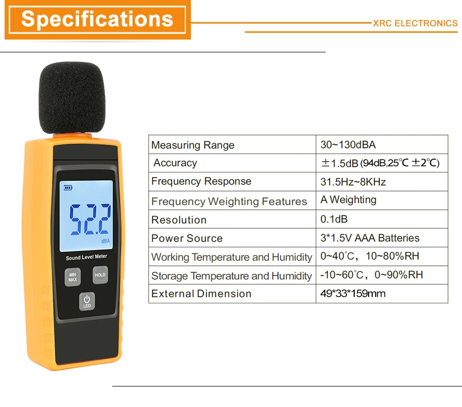Это простой в использовании и удобный мини-измеритель уровня звука. Предназначен для контроля качества звука, который измеряет уровень звука от 30dBA до ~ 130dBA. Он имеет автоматический диапазон, широкий диапазон измерений и частот (31,5 Гц ~ 8 кГц), Максимальное удержание, частотное Взвешивание А и автоматическую подсветку. Просто нажмите одну кнопку показания мгновенно отображаются. Практичный маленький инструмент отлично подходит для мониторинга уровня шума, настройки домашнего кинотеатра, соответствия требованиям безопасности и здоровья, тестирования шума транспортного средства и т. д.