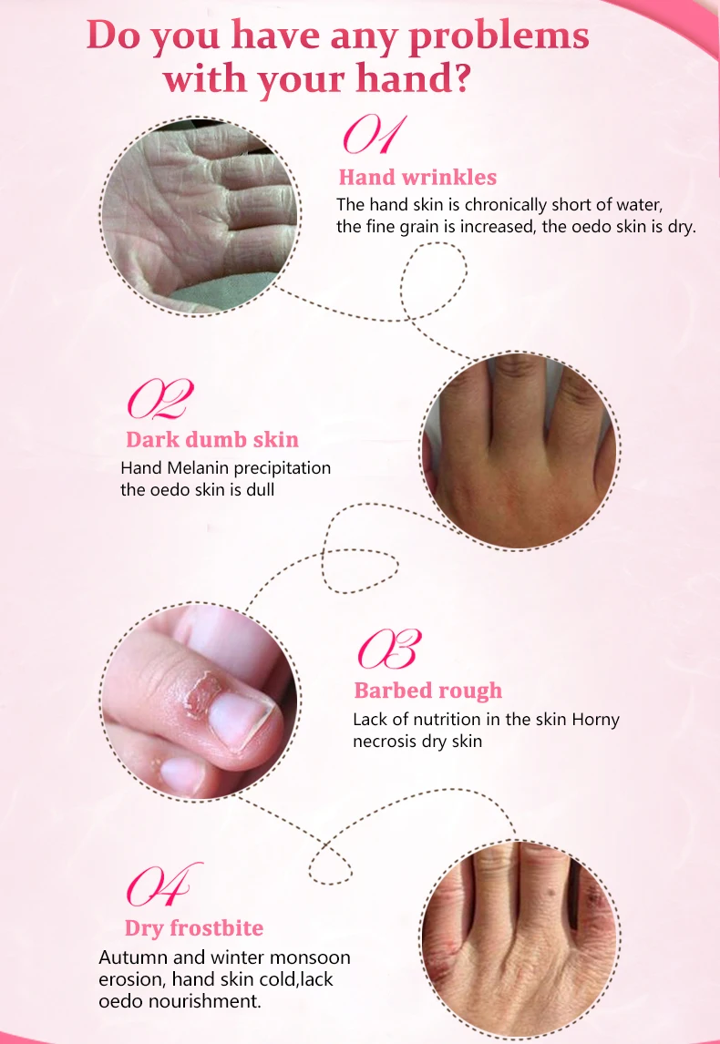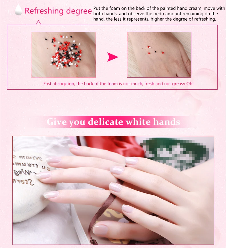 Экстракты розы, тщательное пополнение, увлажнение блокирует воду, мягко защищает кожу рук; Добавляют пептидные укрепляющие ингредиенты, снимают сухие и тонкие линии, вызванные сухостью, улучшают состояние увлажнения кожи; влажная Защитная мембрана на поверхности кожи, потерю влаги нелегко, тщательное увлажнение кожи, Вытрите блестящие гладкие руки.