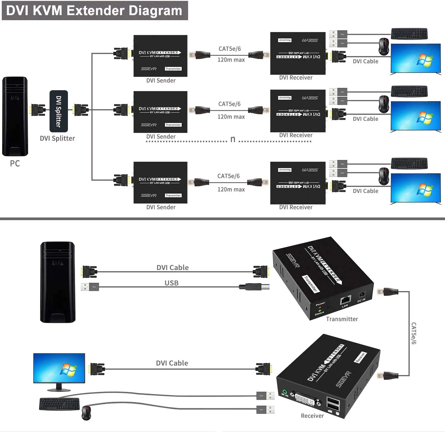 120 м DVI KVM удлинитель, SGEYR 1080p 395ft USB KVM клавиатура мышь ИК удлинитель по RJ45 Cat5e/6 сплиттер с передатчиком + приемником