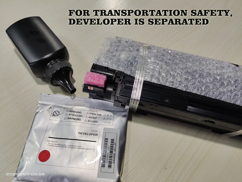 Для безопасности транспортировки Разработчик не заполняется в барабане. Мы упаковали разработчика отдельно в сумку. Пожалуйста, положите разработчика в бутылку и Пополняйте его в барабанный блок.