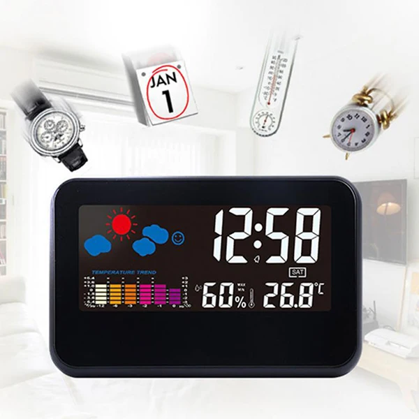 ● Отображает время (12 h или 24 h формат времени)/календарь (2000-2099)/температура (градусы Цельсия или Фаренгейт)/тренд температуры/влажность в помещении/неделю, удовлетворяя ваши ежедневные требования