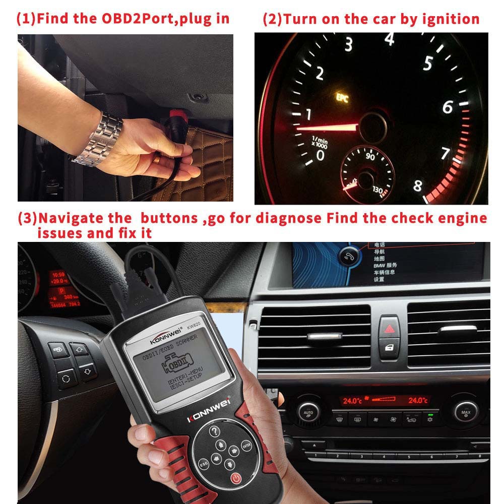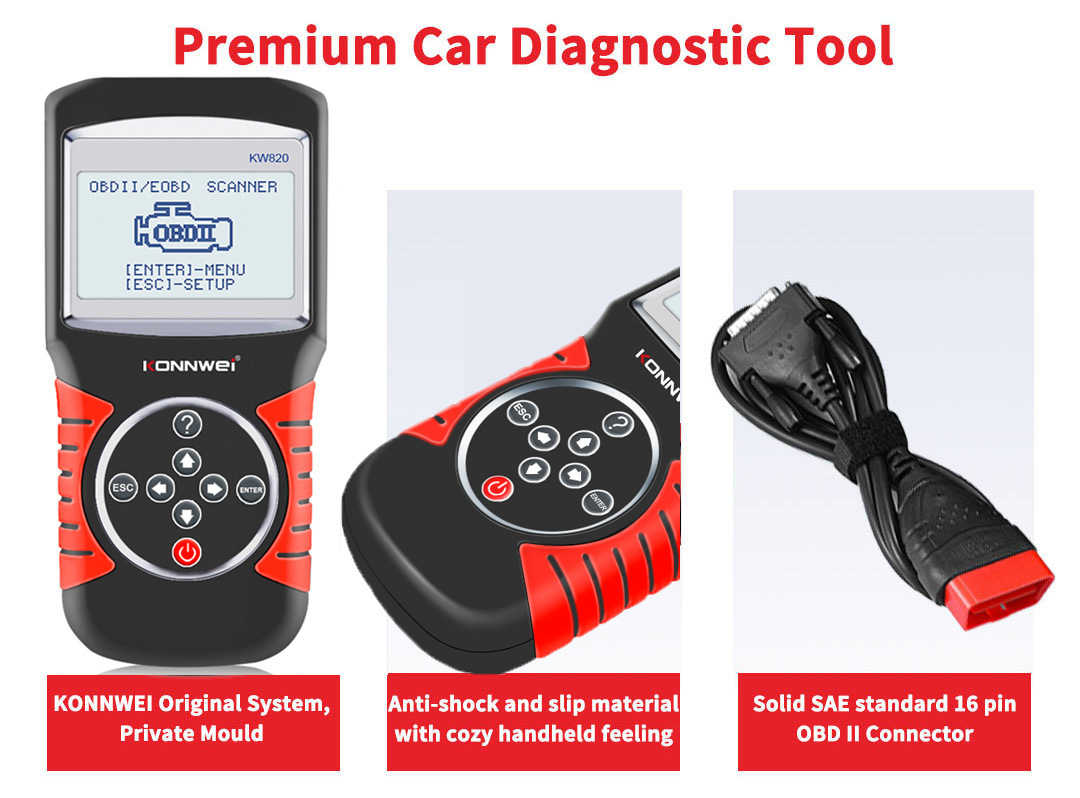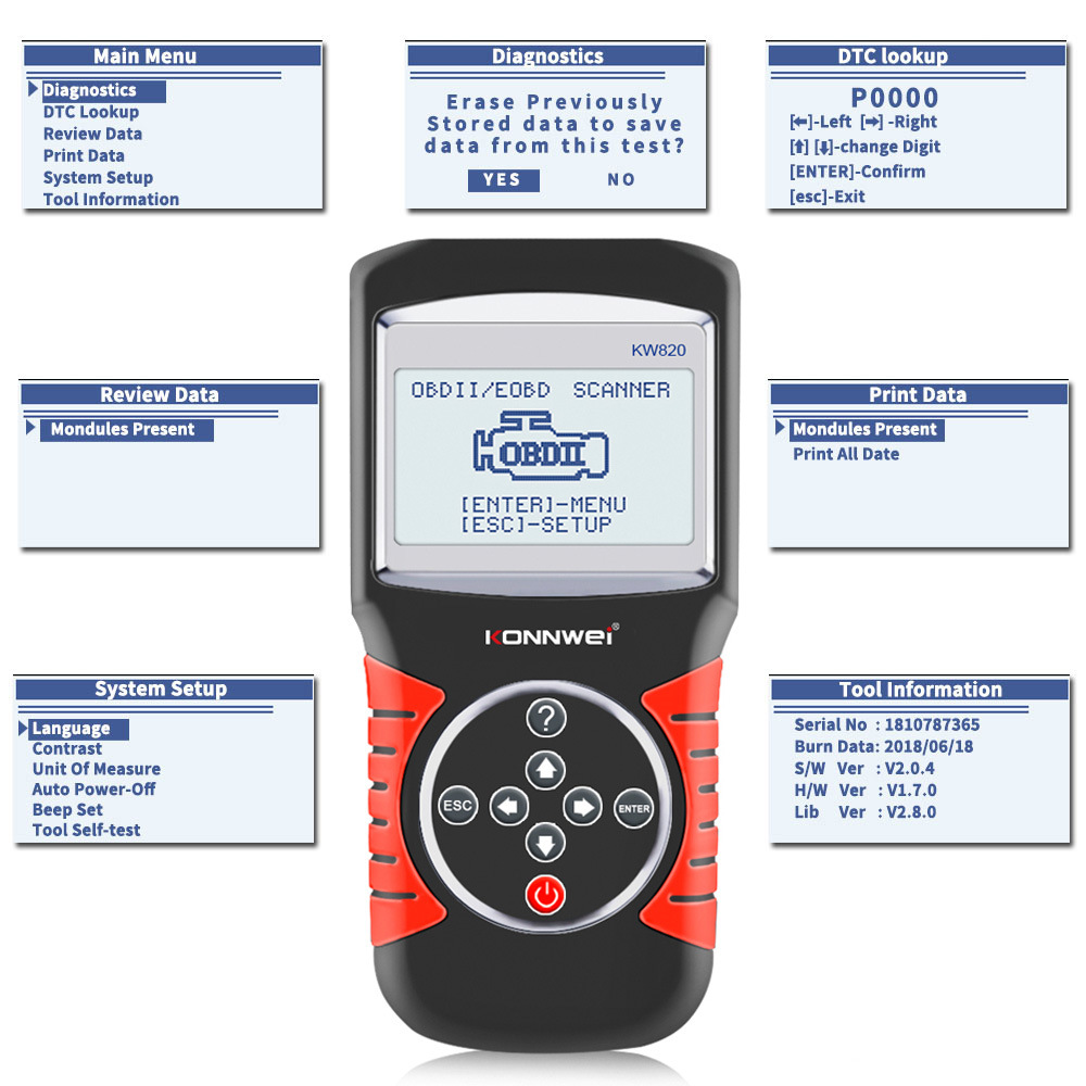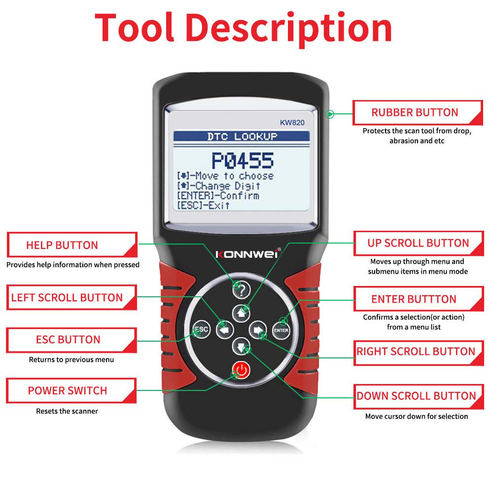 KW820 sup port s и дизельные и бензиновые транспортные средства, если автомобиль совместим со стандартными протоколами OBDII, с диагностическим портом OBDII 16pins. Читает и очищает общие и некоторые коды неисправностей maunfactures.