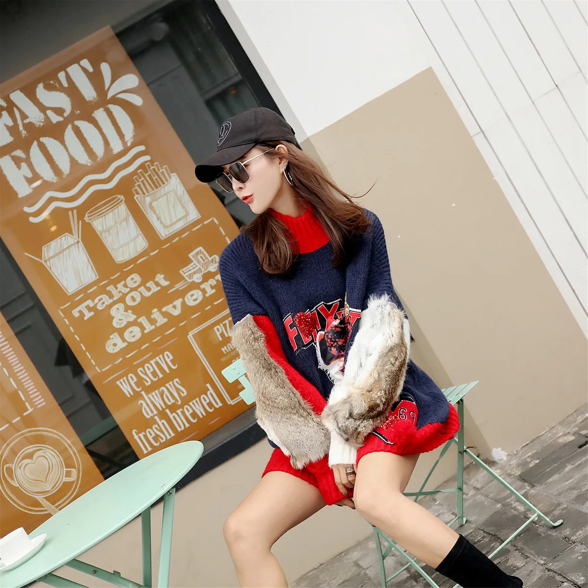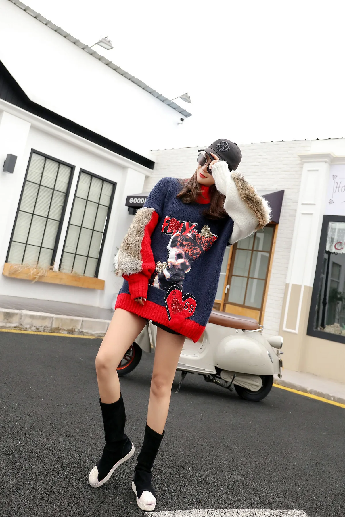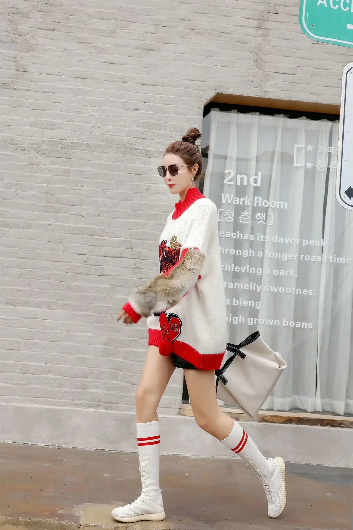 Vefadisa, женский свитер с рукавом из искусственного меха, свитер с животным принтом, женский свитер с воротником-хомутом в стиле пэчворк, пуловер, вязаные зимние топы ZLD093