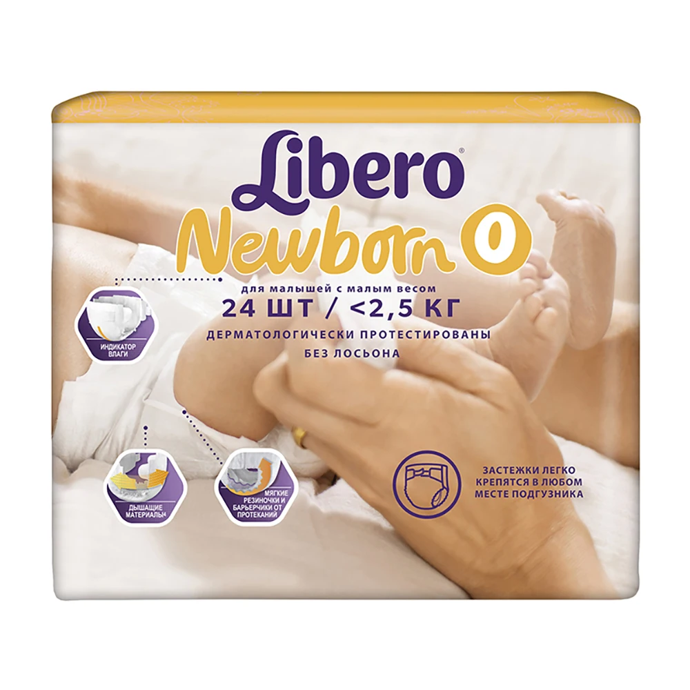 Подгузники Libero Newborn разработаны для защиты нежной кожи новорожденных. Ведь они такие мягкие внутри и снаружи! Пупочек новорожденного очень чувствительный, поэтому нуждается в особой заботе. У Libero Newborn есть специальный вырез для пупка. Тянущиеся боковинки нигде не давят. Подгузники Libero Newborn хорошо впитывают жидкость, оставляют кожу малышей сухой, позволяя им спокойно спать. Новая технология крепление застежек позволяет закрепить их в любом месте подгузника с учетом анатомических особенностей малыша. Преимущества: 1.Новые супер мягкие материалы** внутри и снаружи, мягкий эластичный поясок и тянущиеся боковинки, мягкие резиночки и барьерчики от протеканий. 2. Впитывающий слой с каналами STAY-DRY, которые помогают оптимально впитывать, распределять и удерживать влагу, защищая от протеканий и обеспечивая сухость кожи малыша. 3. Вырез для пупка защищает пупочную ранку от попадания грязи и натираний. В каждой упаковке Libero Newborn вы найдете 2 разных дизайна подгузников! Libero Newborn (0) созданы для малышей до 2,5 кг. Упаковка: 24 штуки. Страна производства: Польша / Швеция. Libero Newborn разработаны для защиты нежной кожи новорожденного малыша. А когда ваш малыш подрастет, используйте Либеро Комфорт! По сравнению с предыдущим поколением Newborn **По сравнению с предыдущим поколением Newborn Стей Драй. Оставаться сухим.
