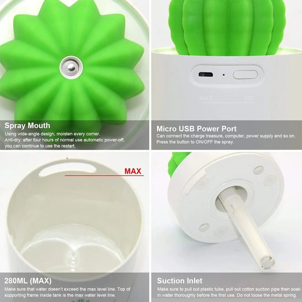 Не используйте эфирные масла, что приведет к тому, что ватный тампон засорится, и увлажнитель воздуха будет непригоден для использования. Ультра-тихий, безопасный и умный дизайн: с ультразвуковой технологией, Никаких Шумных звуков не будет мешать вашему сну или работе. Когда вода будет истощена, она автоматически прекратит вождение. Уход за здоровьем: эффективно убивает бактерии, повышает влажность, помогает предотвратить сухость и сухость в сухое время года, не шумит, усиливает дух и снимает стресс. Портативный и эффективный: питание от USB, 130*80*80 мм, легко носить с собой. Подходит для различных сред спален, офисов, автомобилей, отелей, палаток, даже полетов, игр. Простота в использовании: одним касанием сенсорные переключатели делают работу очень простой. Храните 280 мл воды в бутылке, подключите ее к ПК с помощью usb-кабеля, переместите аккумулятор и т. д., затем включите питание. Он может работать непрерывно в течение 6 часов после открытия. Идеальный подарок: милые кактусы и яркие цвета подарят радость вашей комнате или столу, что станет прекрасным подарком на Рождество или день рождения для родственников, друзей, учеников и одноклассников.