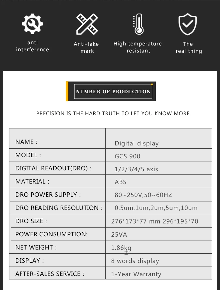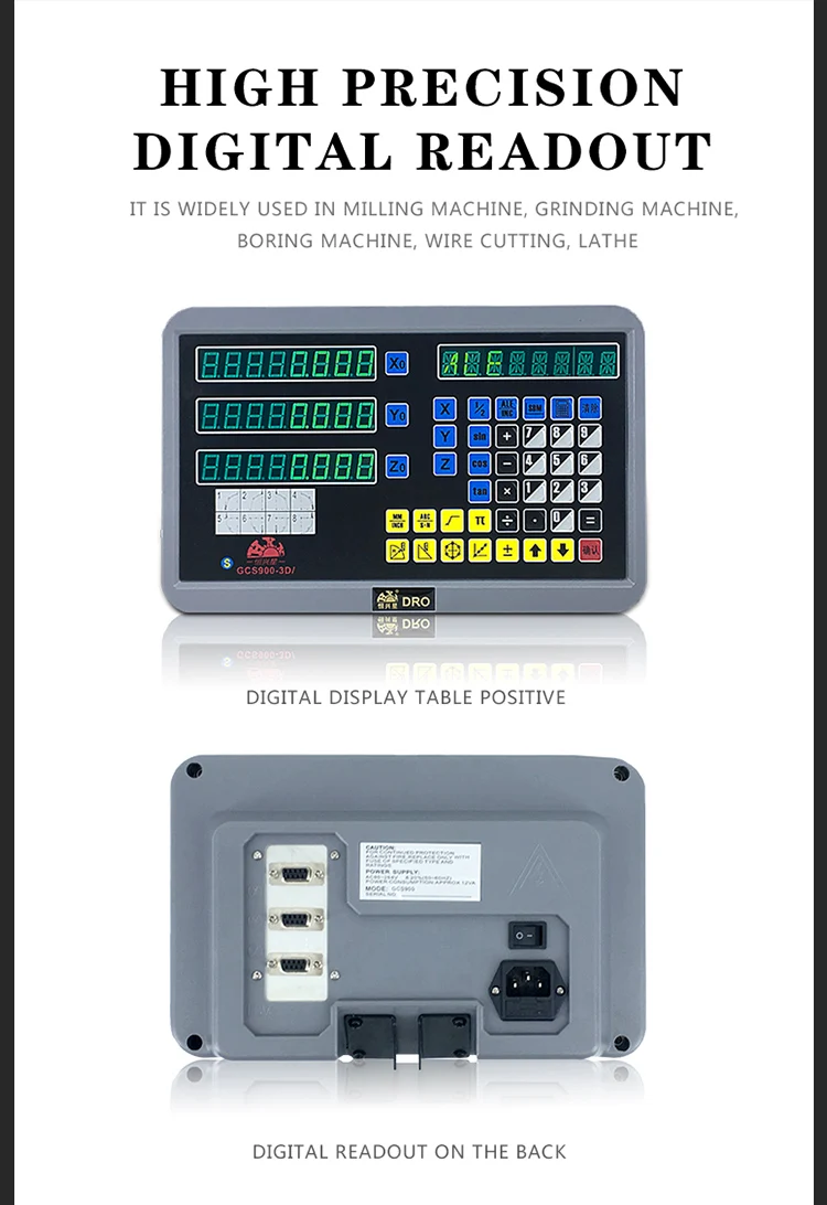 1. Этот заказ включает в себя: 1 шт. 3-осевой цифровой индикации: DRO GCS900-3D с 3 шт. линейной шкалы, Длина путешествия между 50-1000 мм(Длина перемещения может быть настроена, общая длина линейной шкалы = длина путешествия + 138 мм), разрешение/точность 5u, с монтажным кронштейном, кабелем, это один комплект. (можно настроить)